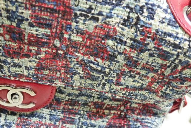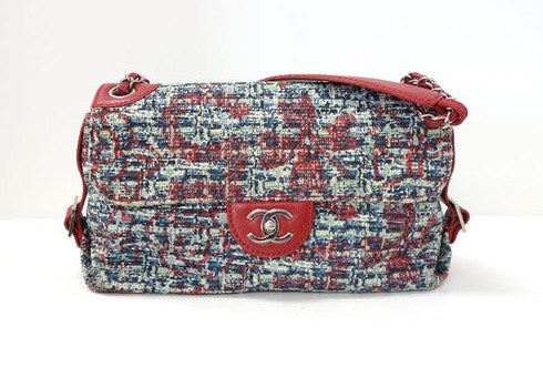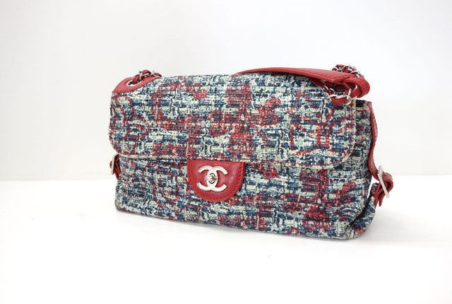 Chanel Red Leather Blue Multicolor Tweed Shoulder Bag. All available information is listed in the description and shown in the photos. Chanel shoulder bag is made of white-and-blue tweed fabric printed with subtle red symbols (a camellia flower, the number 5, and a four-leaf clover) and red leather details, this bag secures with a silver-tone interlocking CC logo turnlock. The interior is lined in white logo jacquard fabric with one zipped pocket, while up above complete with the chain-and-leather strap. 11"L x 4"W x 6.5"H, Shoulder Strap Drop 6.5"