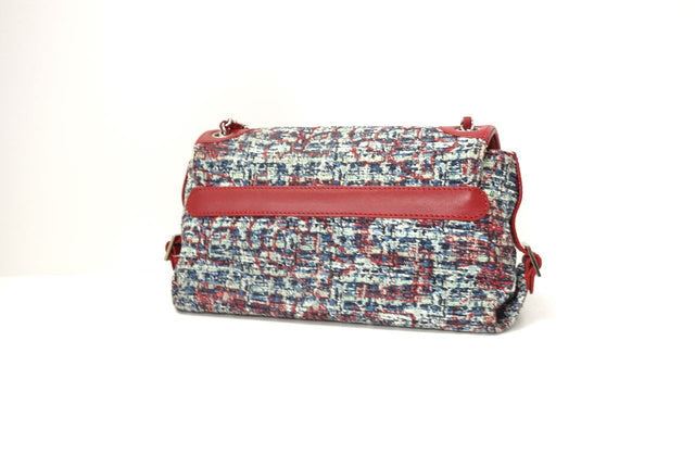 Chanel Red Leather Blue Multicolor Tweed Shoulder Bag. All available information is listed in the description and shown in the photos. Chanel shoulder bag is made of white-and-blue tweed fabric printed with subtle red symbols (a camellia flower, the number 5, and a four-leaf clover) and red leather details, this bag secures with a silver-tone interlocking CC logo turnlock. The interior is lined in white logo jacquard fabric with one zipped pocket, while up above complete with the chain-and-leather strap. 11"L x 4"W x 6.5"H, Shoulder Strap Drop 6.5"