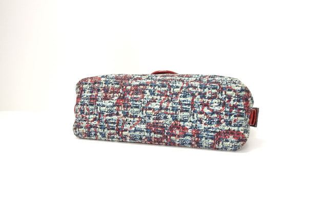 Chanel Red Leather Blue Multicolor Tweed Shoulder Bag. All available information is listed in the description and shown in the photos. Chanel shoulder bag is made of white-and-blue tweed fabric printed with subtle red symbols (a camellia flower, the number 5, and a four-leaf clover) and red leather details, this bag secures with a silver-tone interlocking CC logo turnlock. The interior is lined in white logo jacquard fabric with one zipped pocket, while up above complete with the chain-and-leather strap. 11"L x 4"W x 6.5"H, Shoulder Strap Drop 6.5"