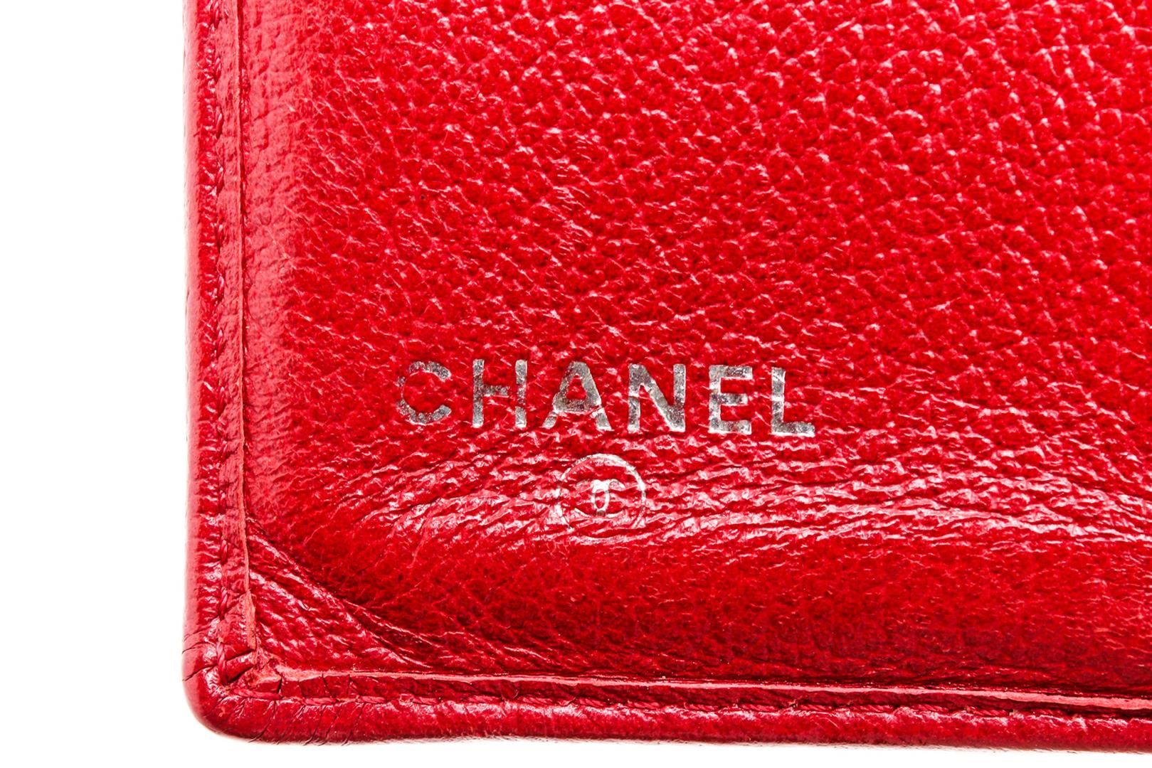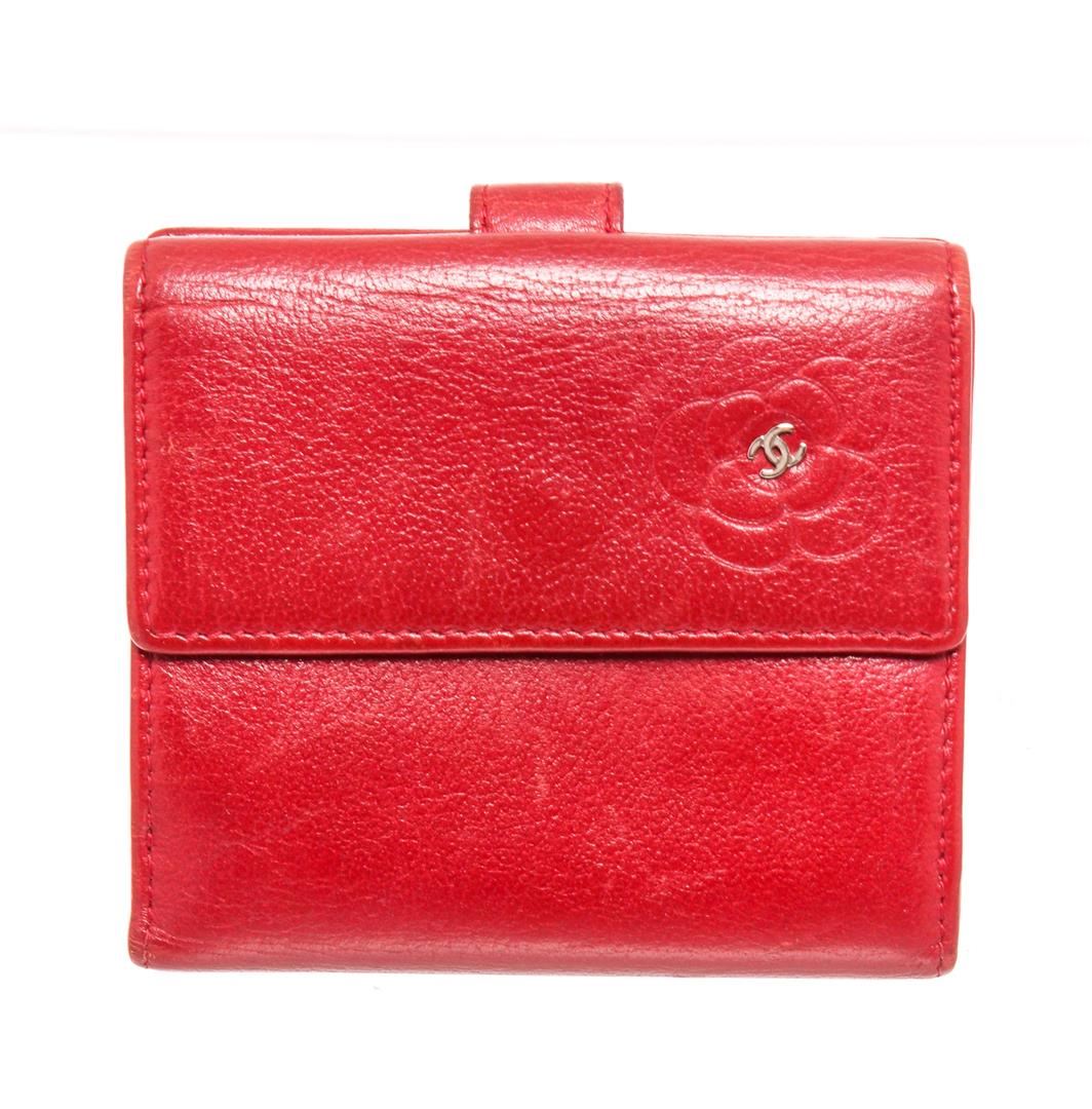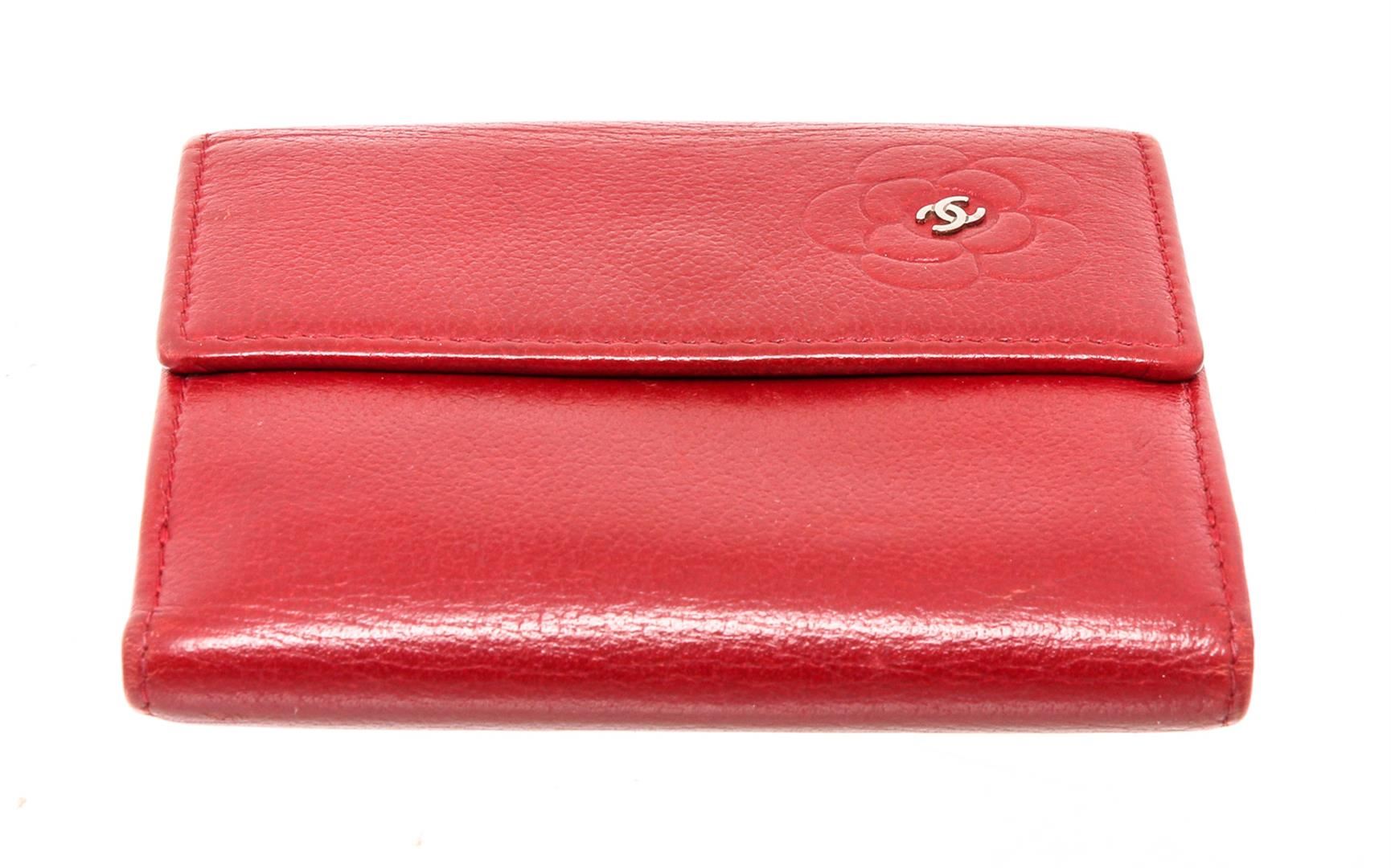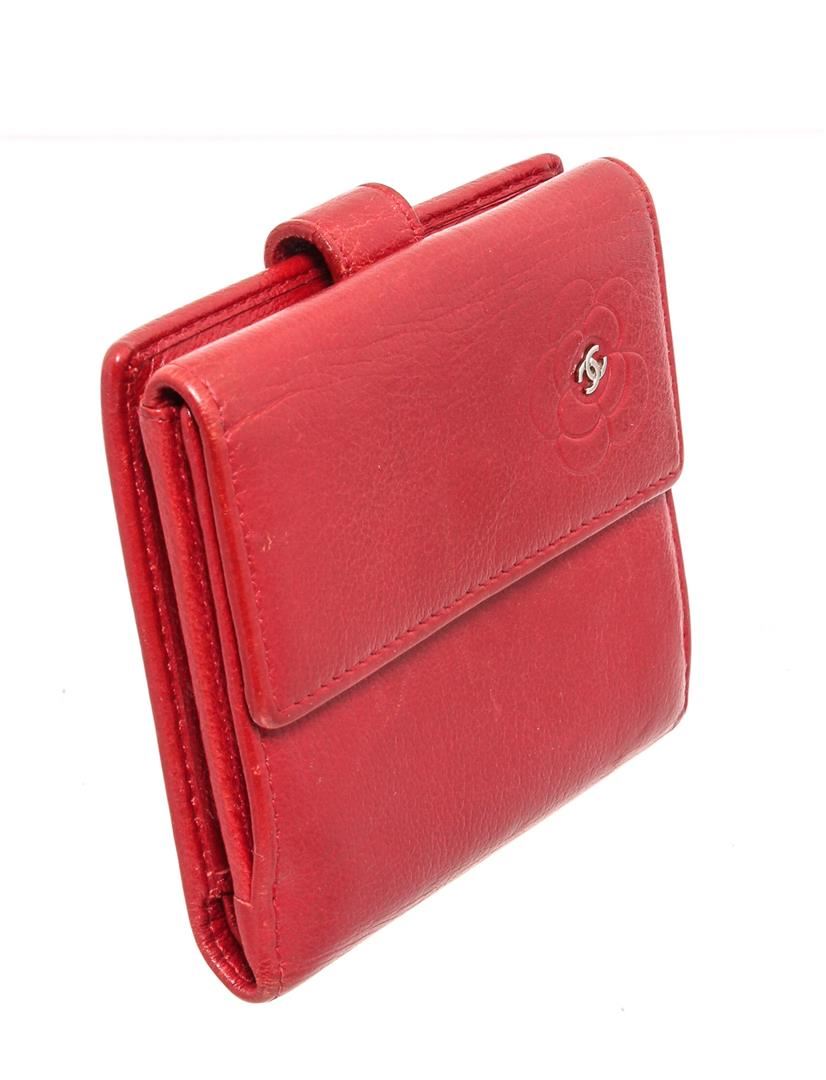 Red leather Chanel compact wallet with camellia accent, silver-tone CC logo at exterior trim, exterior compartment with snap closure, tonal leather lining, six card slots, dual interior pockets, single bill compartment and snap closure at top.