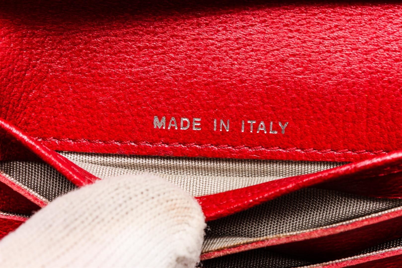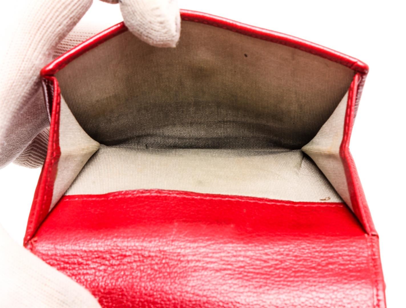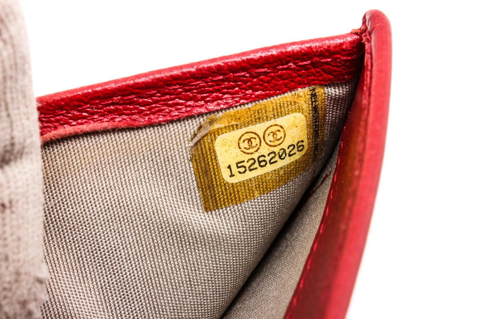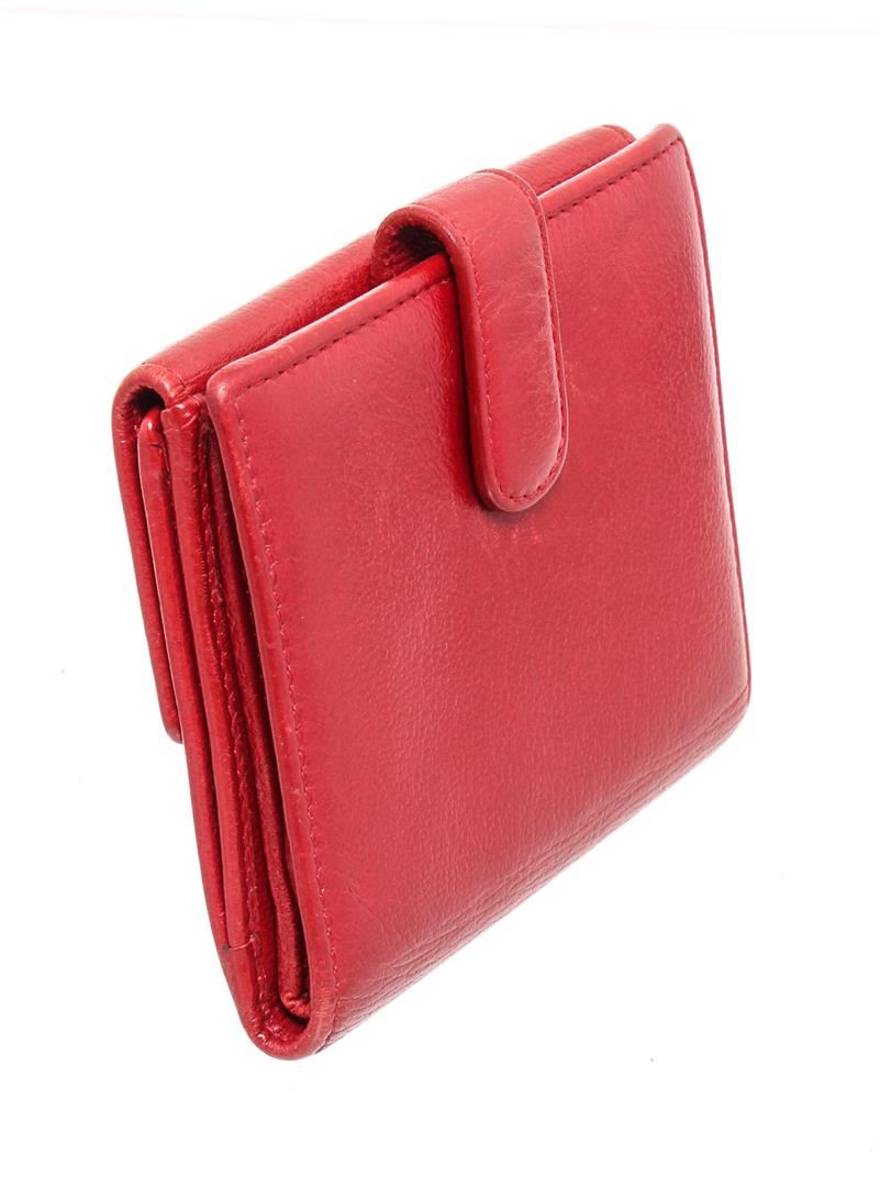 Red leather Chanel compact wallet with camellia accent, silver-tone CC logo at exterior trim, exterior compartment with snap closure, tonal leather lining, six card slots, dual interior pockets, single bill compartment and snap closure at top.