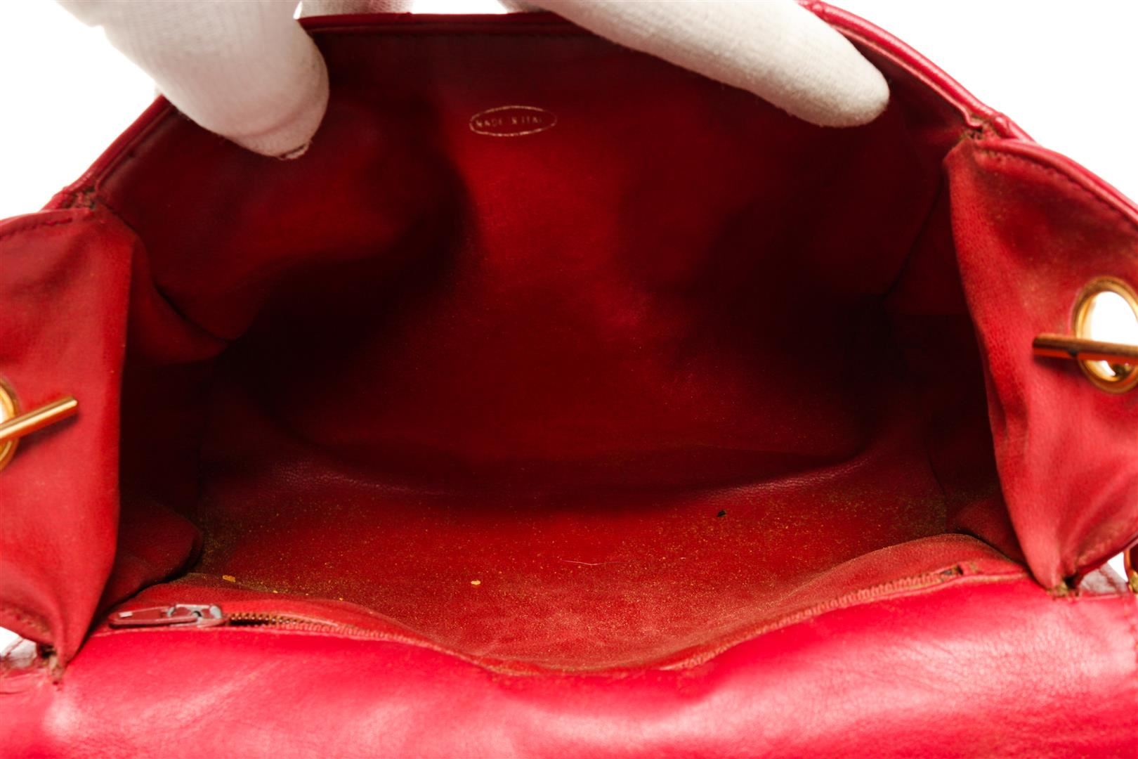 Chanel Red Leather Chain Buckle Flap Shoulder Bag. All available information is listed in the description and shown in the photos. Chanel red leather chain buckle flap shoulder bag with red quilted leather exterior, red leather lining, gold-tone hardware, a long chain with shoulder pad, buckle closure, one main compartment, and one interior zip pocket. There is a scratch on the front, peeling on the lining. Please refer to photos. Body is vintage and body has a chunky feel to it.