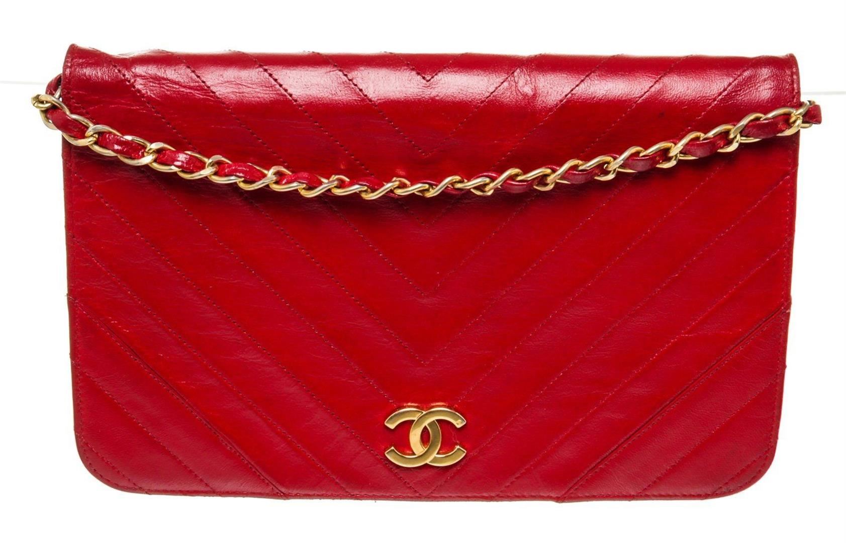 Chanel Red Leather Full Flap Shoulder Bag. All available information is listed in the description and shown in the photos. Chanel Red Leather Full Flap Shoulder Bag with leather, gold-tone hardware, interior slip pocket, chain shoulder strap and snap closure. Measurements: 9 in / 23 cm 2 in / 5 cm 6 in / 15 cm Condition: Pre-Owned Good