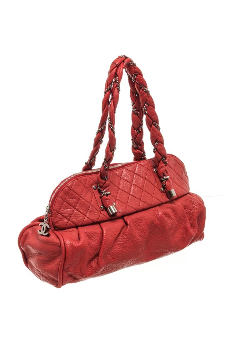 One Chanel Red Leather Large Lady Braid Bowler Bag. Item is sold AS-IS. All available information is listed in the description and shown in the photo. Chanel red leather large lady braid bowling bag with red lambskin exterior, silver-tone hardware, dual leather-chain shoulder straps, brown satin lining, zip closure, interlocking CC logo on the zipper tab, and two interior pockets: one zip and one slip. Height: 12 in (30.48 cm), Width: 18 in (45.72 cm), Depth: 5.5 in (13.97 cm)