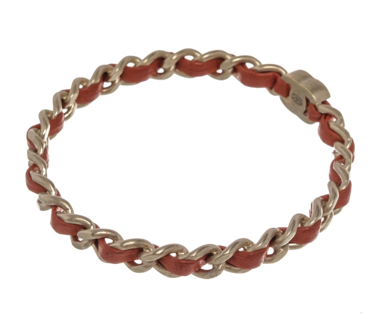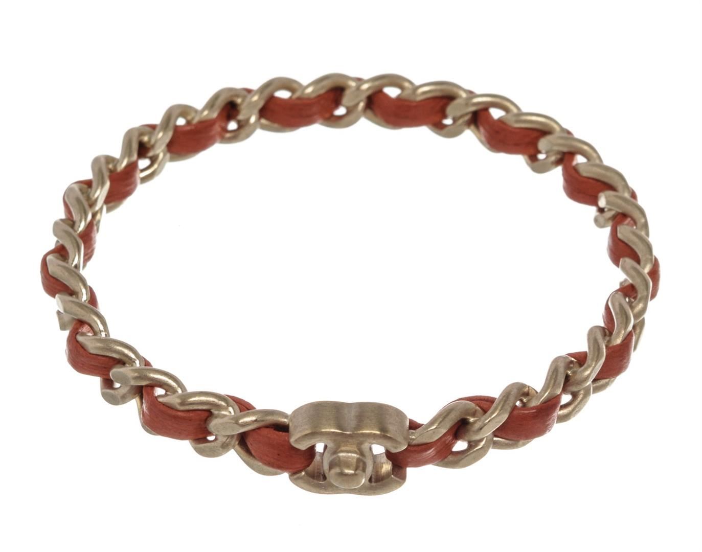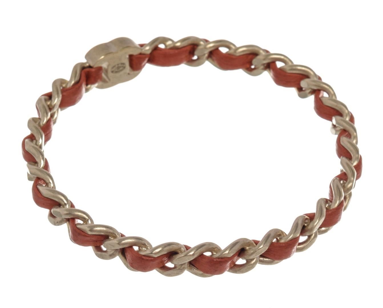 One Chanel Red Leather Woven Silver-tone Chain-link CC Bangle Bracelet. Item is sold AS-IS. Please check photos and descriptions for all available details. Red leather woven chain-link Chanel CC bangle bracelet with CC logo and silver-tone hardware.