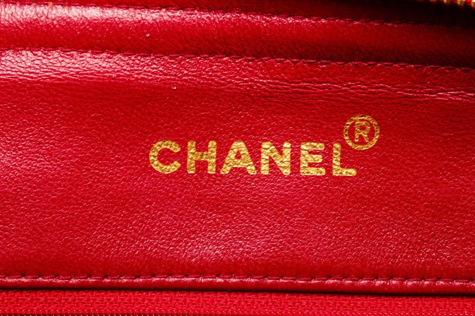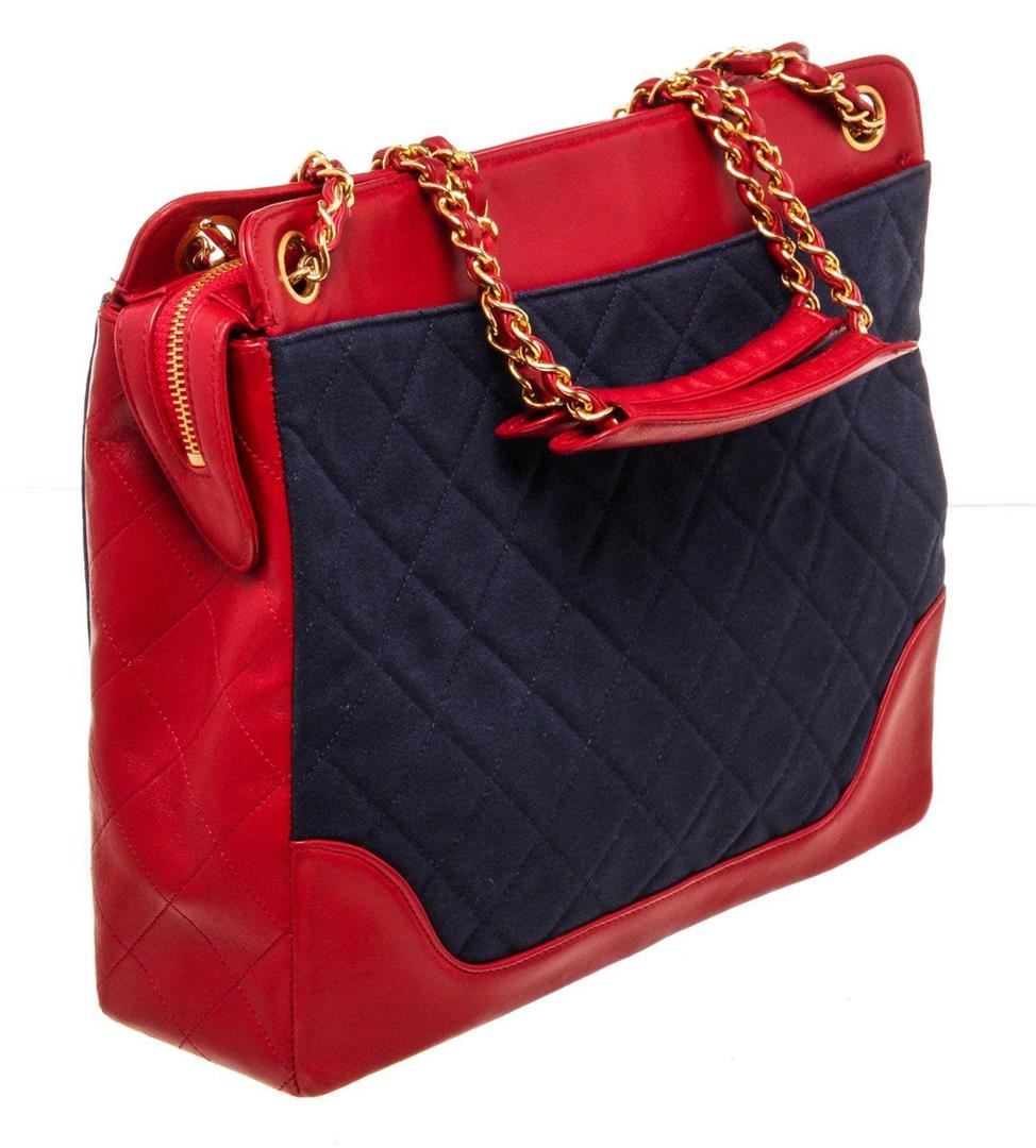 Chanel Red Nevy Denim Canvas Chain Tote Bag with canvas, gold-tone hardware, interior zip pocket, chain shoulder strap and snap closure.