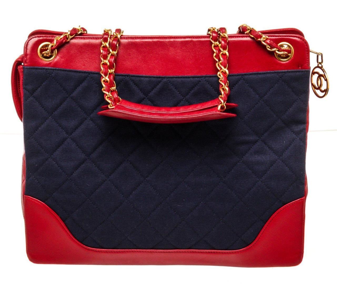 Chanel Red Nevy Denim Canvas Chain Tote Bag