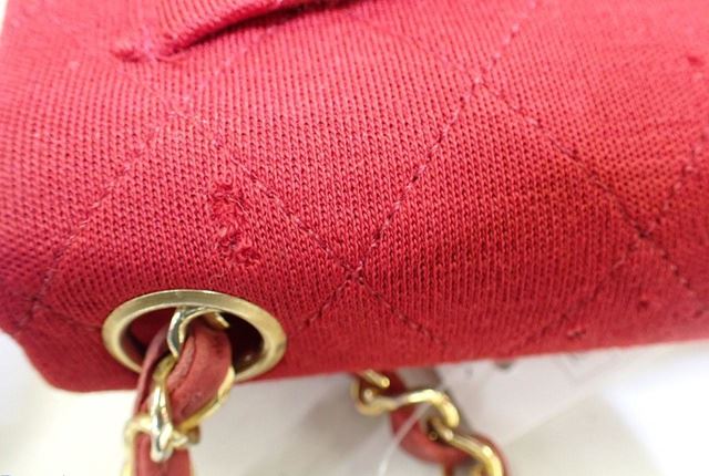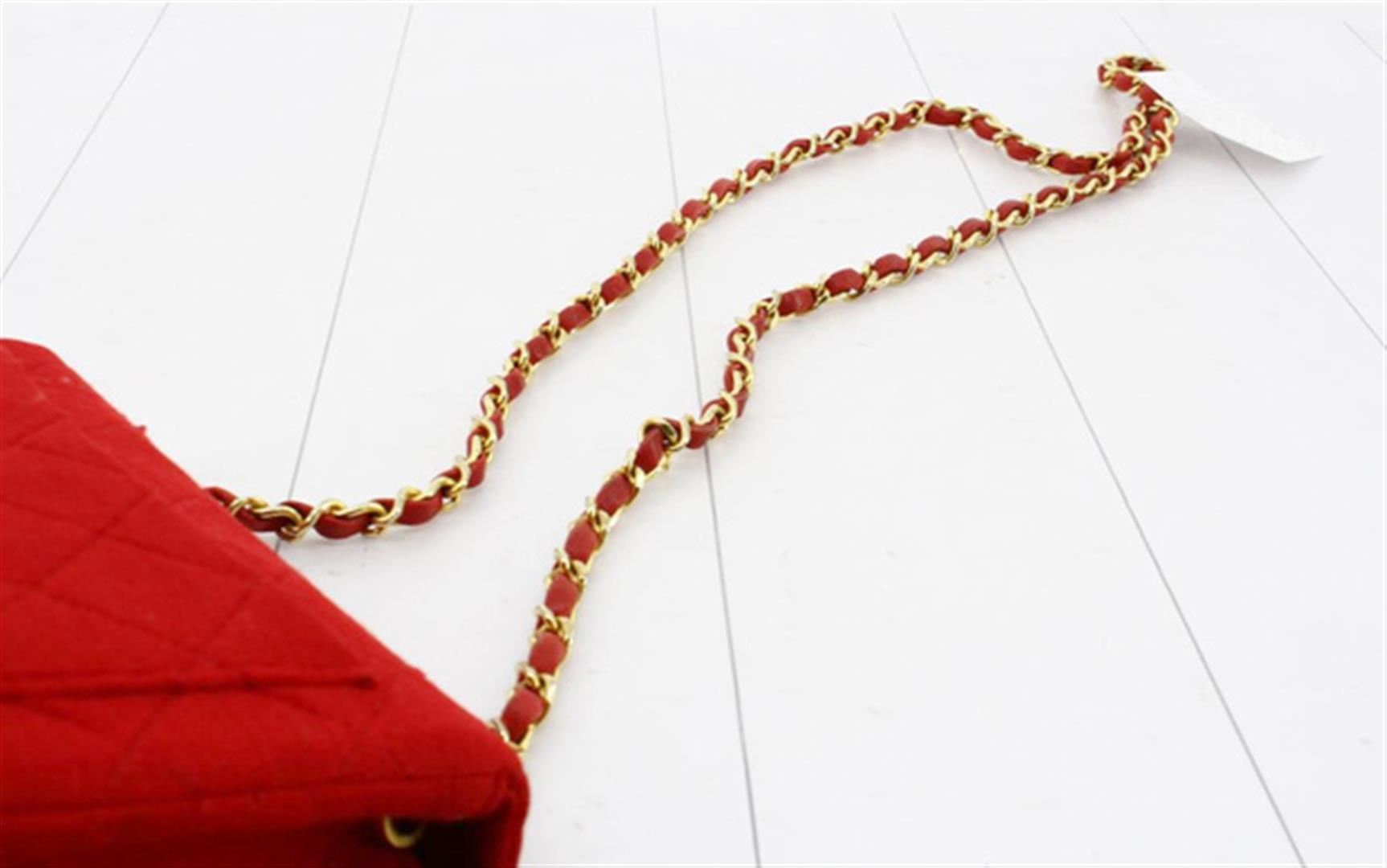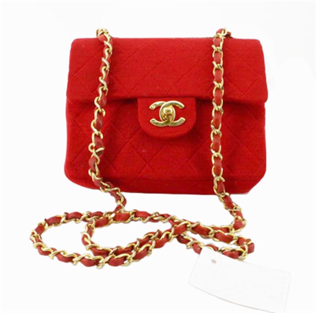 One Chanel Red Quilted Canvas CC Mini Square Flap Shoulder Bag. Item is sold AS-IS. All available information is listed in the description and shown in the photo. Red quilted canvas Chanel CC Mini Square Flap shoulder bag with gold-tone hardware, an interlocking CC turn-lock closure, a patch pocket at back, woven leather and chain-link shoulder strap, red leather lining and two pocket inside; one slip and one with zipper. 7" length x 4.5" height x 2.5" width, Strap Drop: 22"