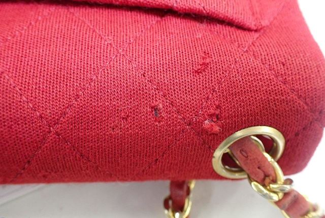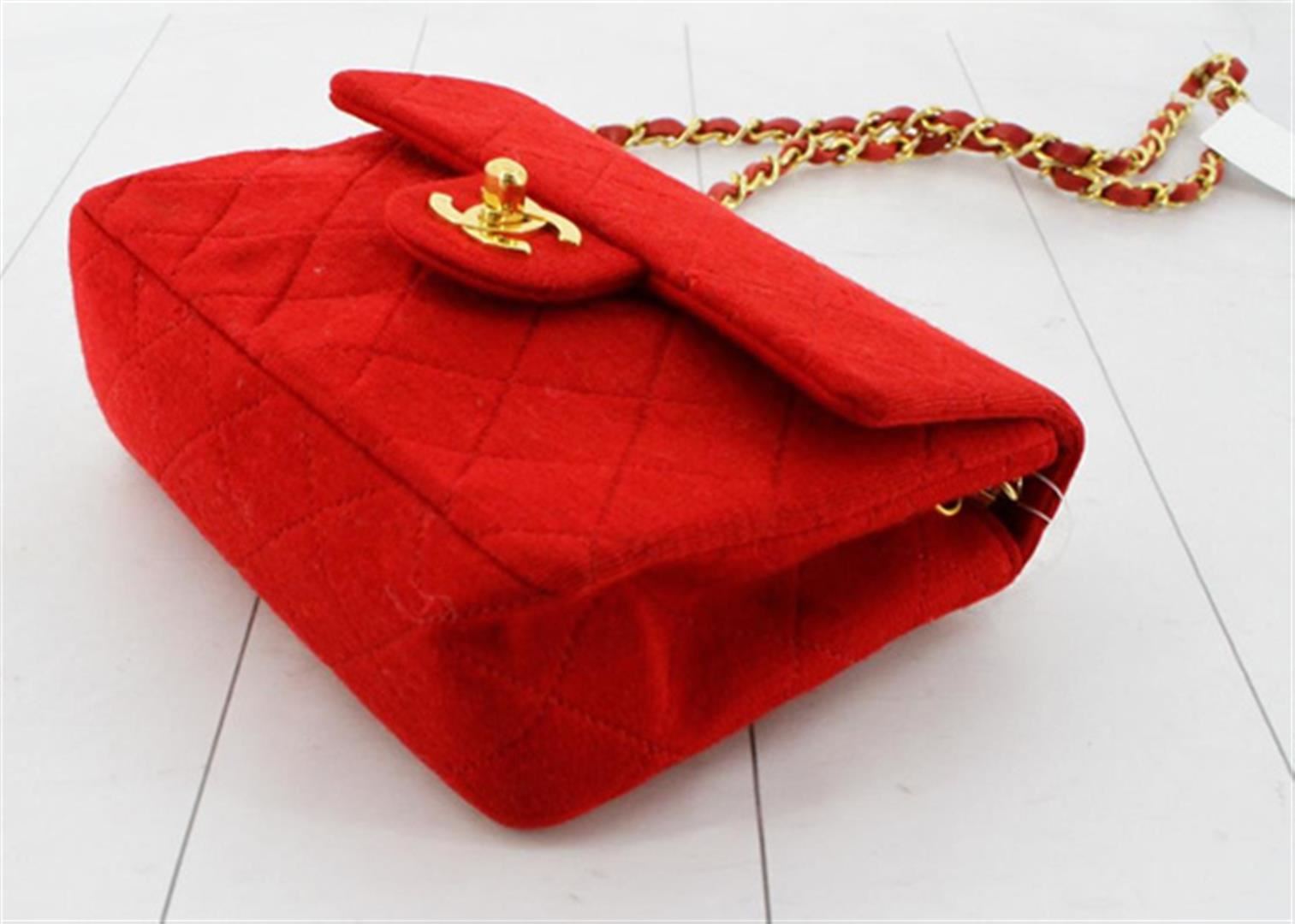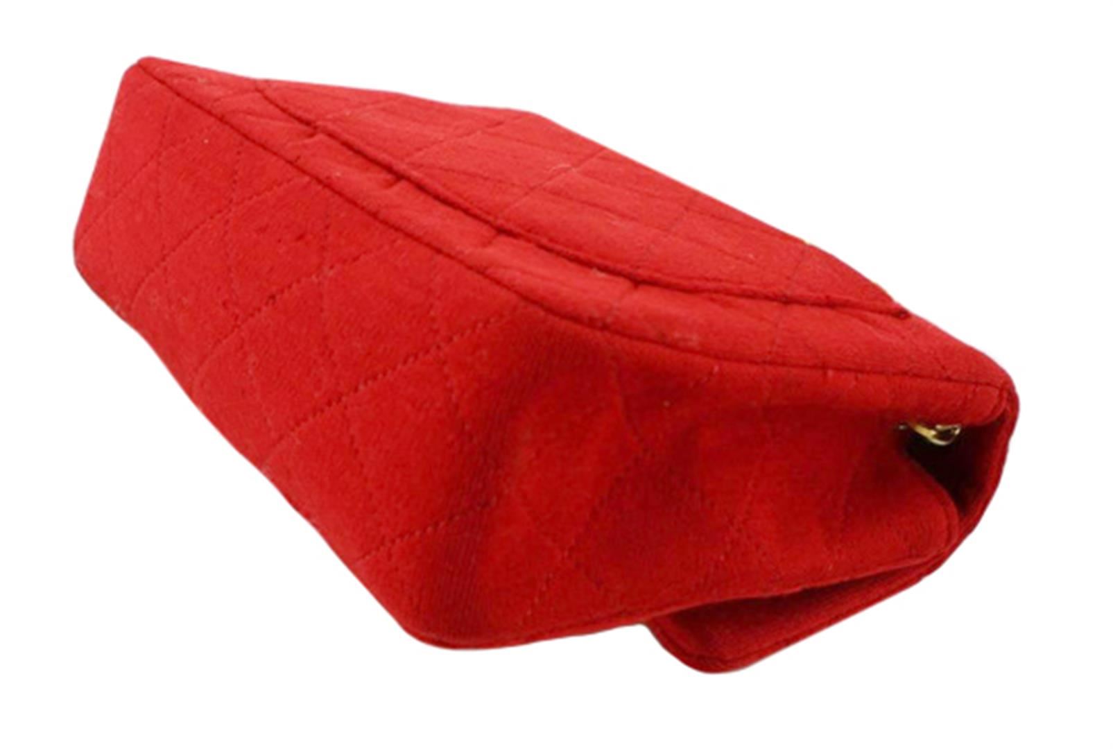 One Chanel Red Quilted Canvas CC Mini Square Flap Shoulder Bag. Item is sold AS-IS. All available information is listed in the description and shown in the photo. Red quilted canvas Chanel CC Mini Square Flap shoulder bag with gold-tone hardware, an interlocking CC turn-lock closure, a patch pocket at back, woven leather and chain-link shoulder strap, red leather lining and two pocket inside; one slip and one with zipper. 7" length x 4.5" height x 2.5" width, Strap Drop: 22"