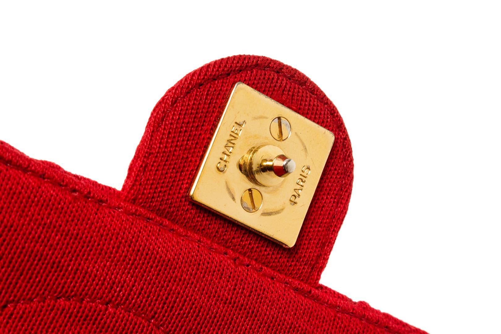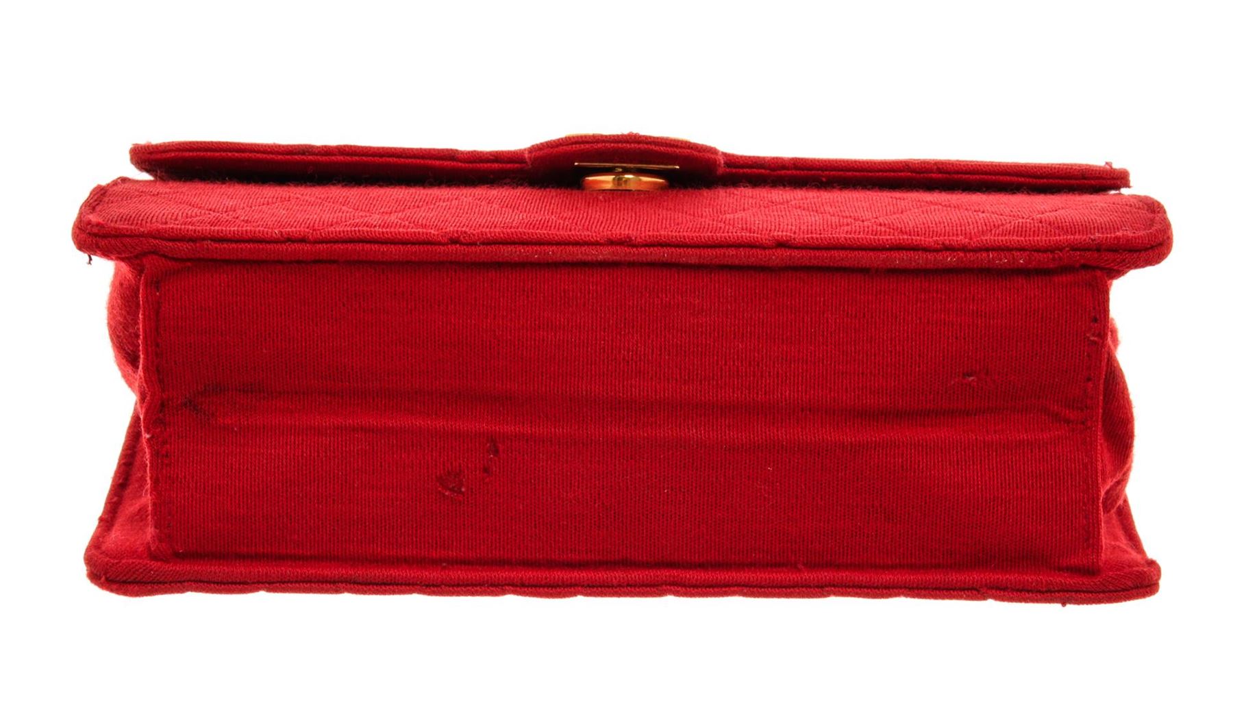 One Chanel Red Quilted Fabric Single Flap Bag. Item is sold AS-IS. All available information is listed in the description and shown in the photo. Chanel Red Quilted Fabric Single Flap Bag with gold-tone hardware, red leather lining, interior zip pocket, chain leather shoulder strap, and flap closure with CC turn-lock. .