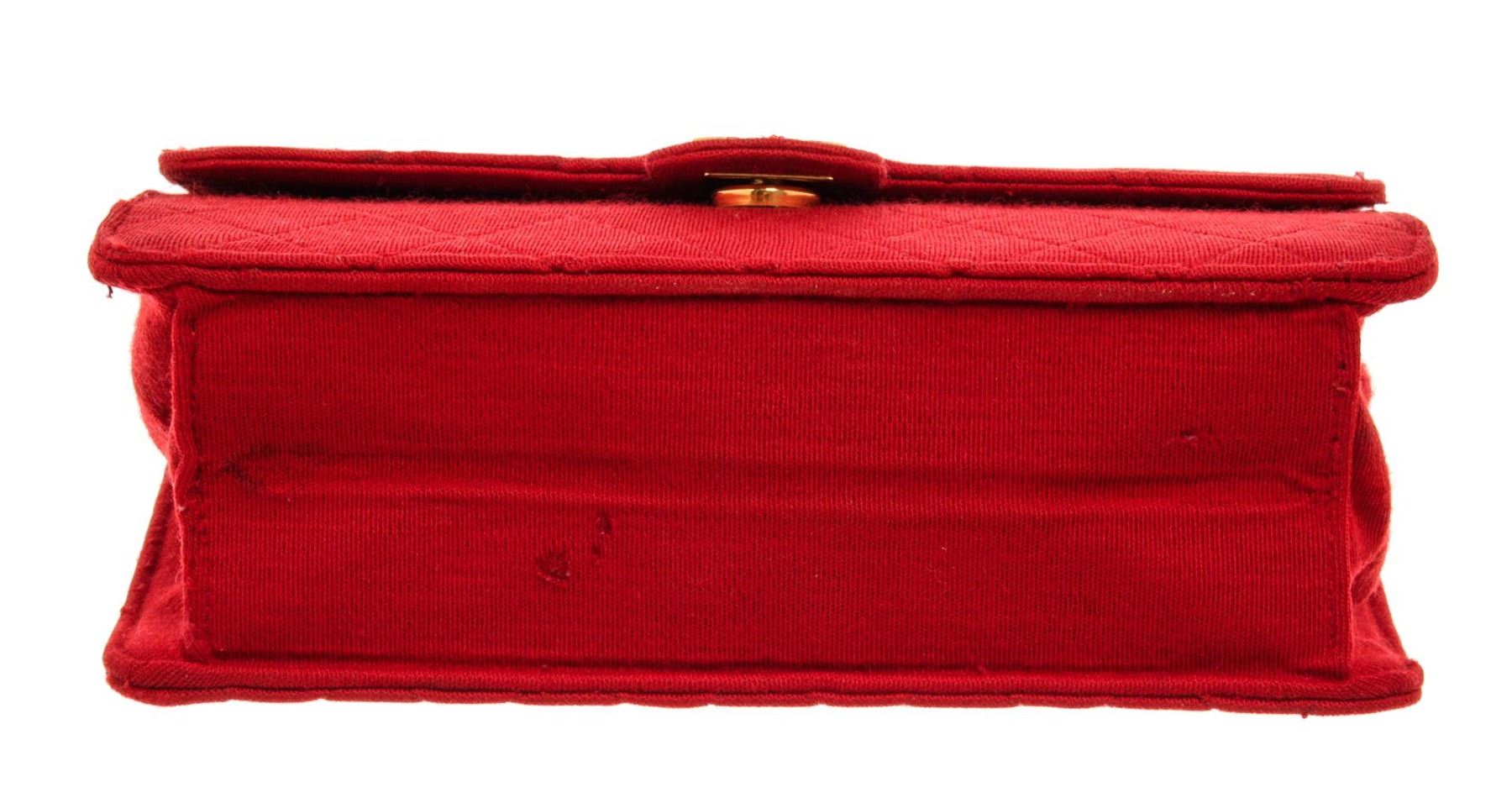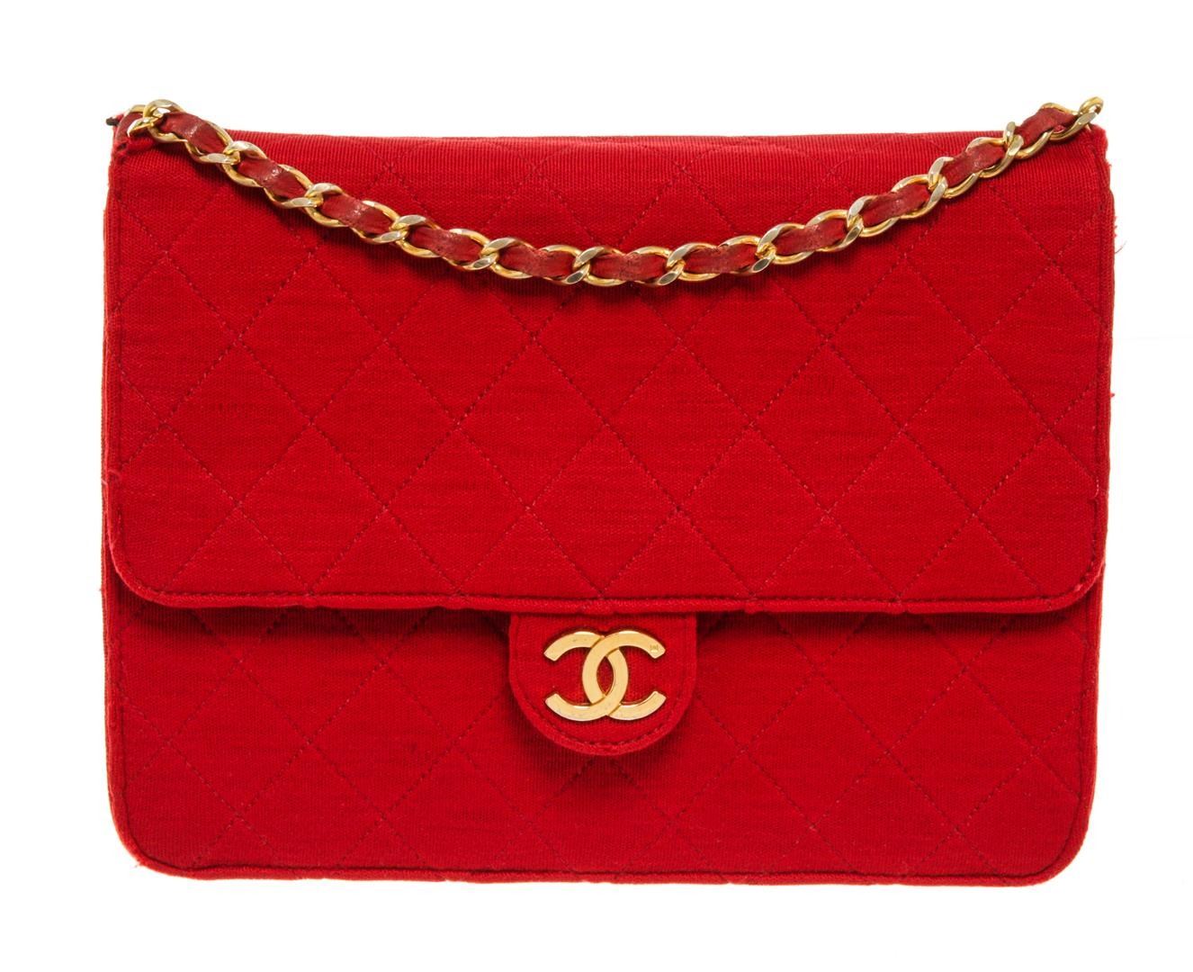 One Chanel Red Quilted Fabric Single Flap Bag. Item is sold AS-IS. All available information is listed in the description and shown in the photo. Chanel Red Quilted Fabric Single Flap Bag with gold-tone hardware, red leather lining, interior zip pocket, chain leather shoulder strap, and flap closure with CC turn-lock. .