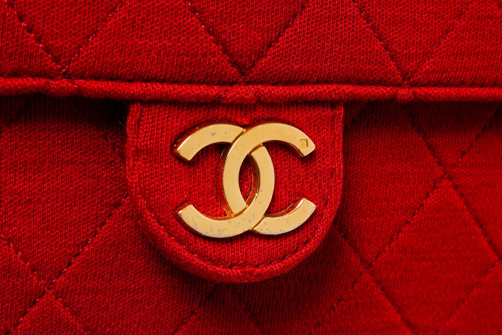 One Chanel Red Quilted Fabric Single Flap Bag. Item is sold AS-IS. All available information is listed in the description and shown in the photo. Chanel Red Quilted Fabric Single Flap Bag with gold-tone hardware, red leather lining, interior zip pocket, chain leather shoulder strap, and flap closure with CC turn-lock. .