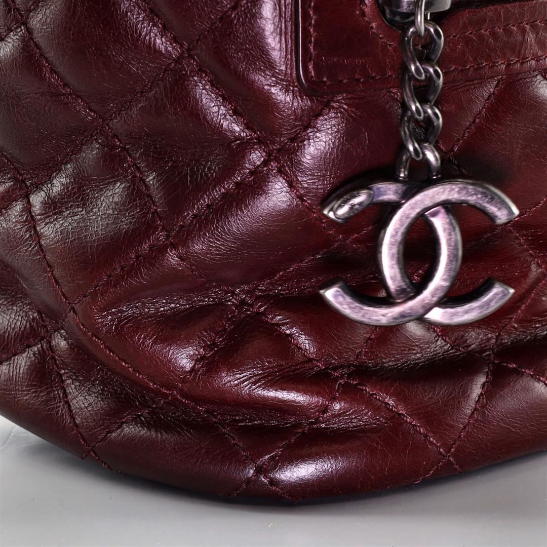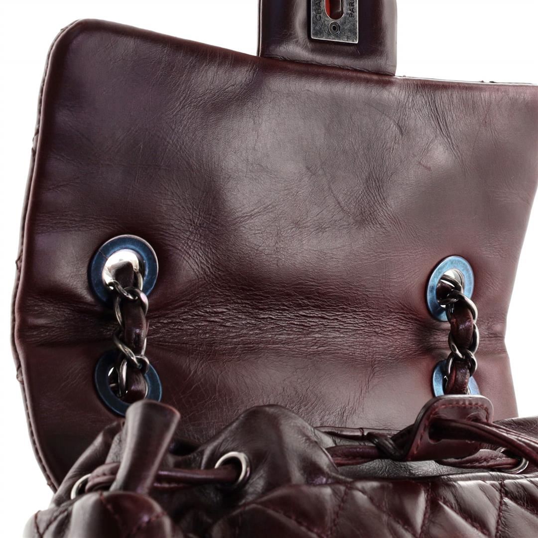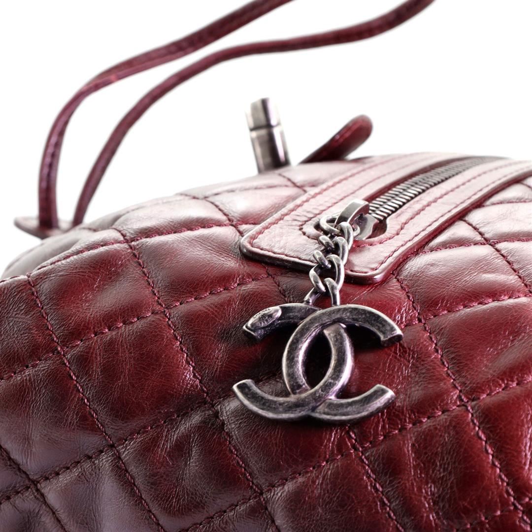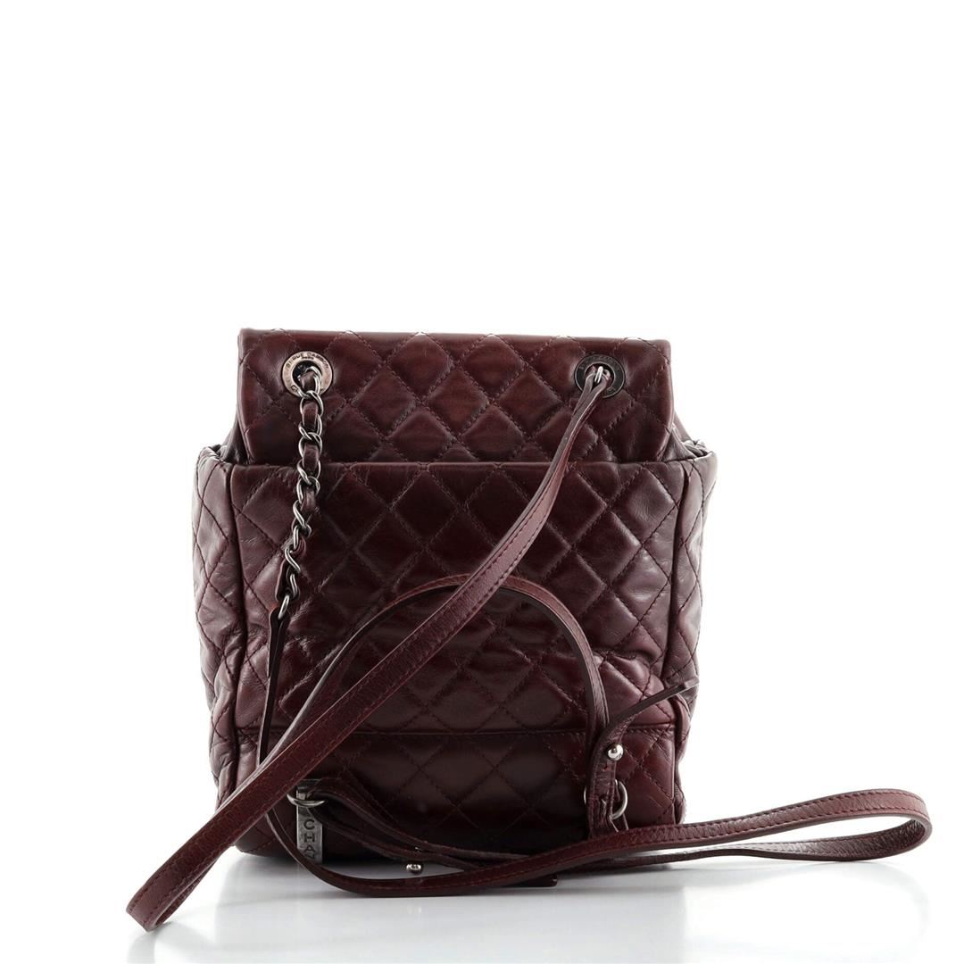 Chanel Red Quilted Glazed Calfskin Leather Mountain Small Backpack Condition Details: Odor in interior. Moderate creasing, scuffs, discoloration and wear on exterior and underneath flap. Splitting and peeling on strap wax edges, cracking on strap wax e