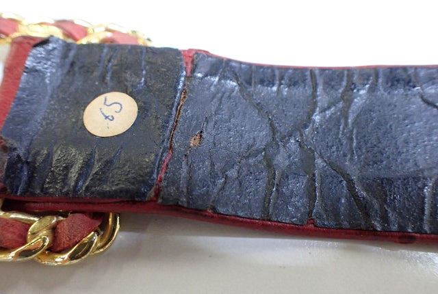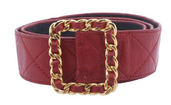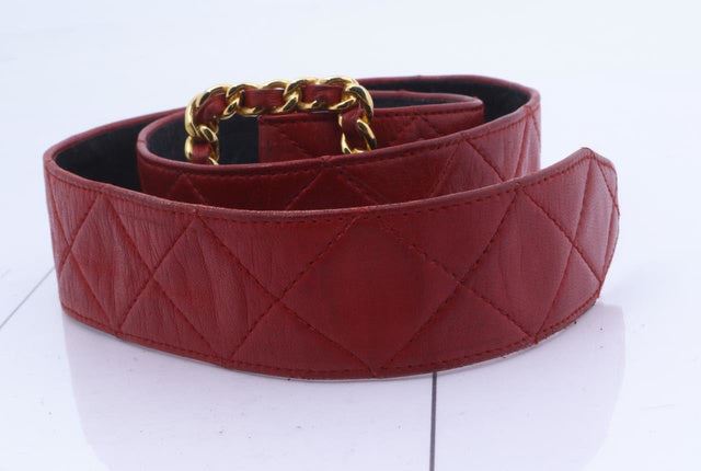 One Chanel Red Quilted Lambskin Leather Matelasse Belt. Item is sold AS-IS. Please check photos and descriptions for all available details. Chanel Belt features red quilted Lambskin leather, gold-tone hardware, braided-chain buckle for fastening and black inner leather.