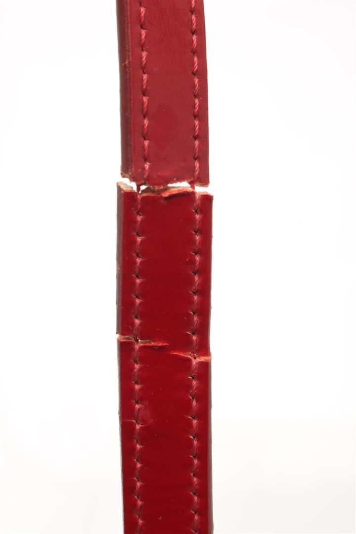 Chanel Red Quilted Patent Bowling Chain Shoulder Bag. All available information is listed in the description and shown in the photos. patent leather threaded silver shoulder straps with patent leather shoulder pads and a dangling silver Chanel CC medallion. The top is open to red fabric multiple compartments with a zippered closure. Height: 5.25 in, Width: 4.50 in, length: 10.50 in/ 13.33 x 11.43 x 26.67 CM