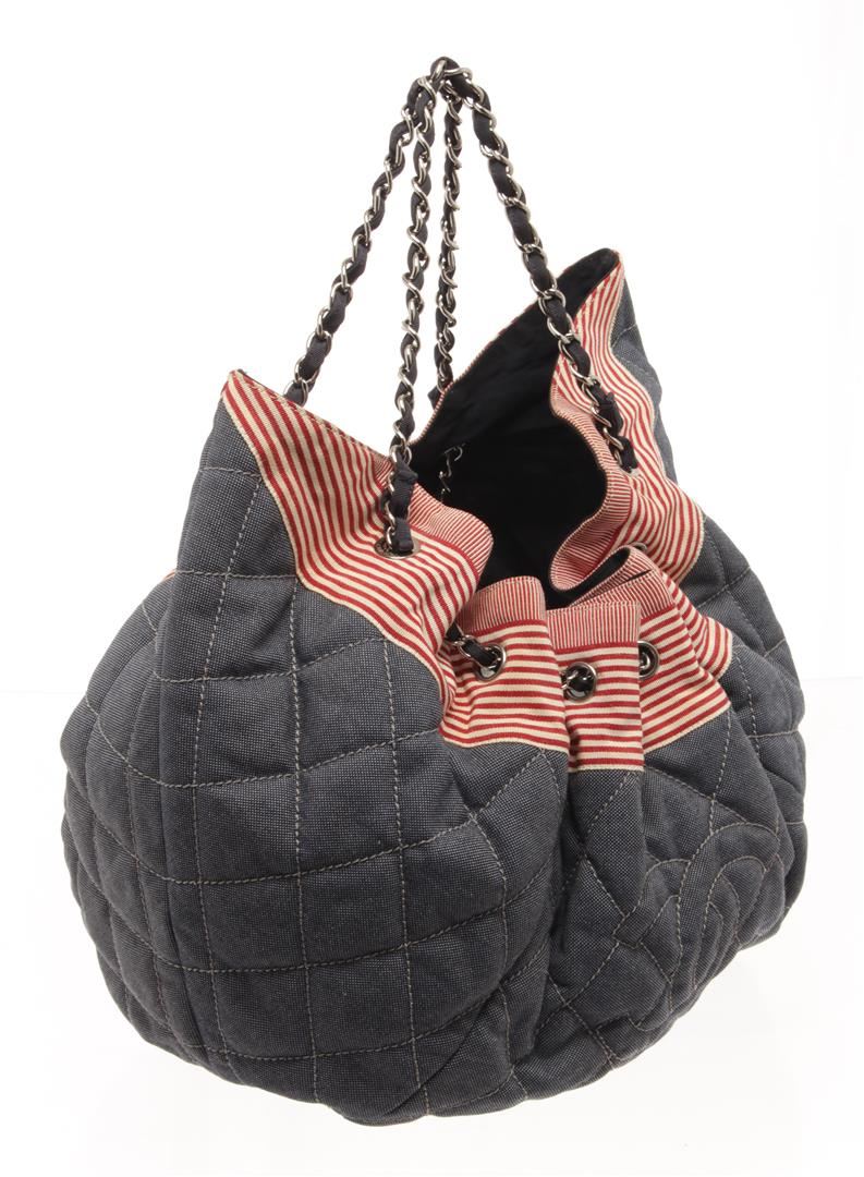 Chanel Red White Coco Cabas GM Stretch Spirit Shoulder Bag. All available information is listed in the description and shown in the photos. chanel stretch spirit cabas bag. made in dark blue denim with embroidered front chanel cc logo. red and white striped upper edge. silver-tone metal chain handles intertwined with blue grosgrain ribbon. Width: 50 cm, Height: 32 cm, Depth: 20 cm / 19.68" x 12.59" x 7.87" Inches