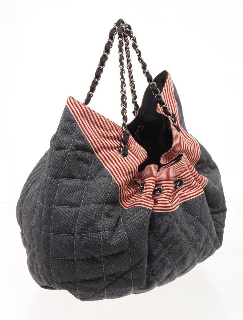 Chanel Red White Coco Cabas GM Stretch Spirit Shoulder Bag. All available information is listed in the description and shown in the photos. chanel stretch spirit cabas bag. made in dark blue denim with embroidered front chanel cc logo. red and white striped upper edge. silver-tone metal chain handles intertwined with blue grosgrain ribbon. Width: 50 cm, Height: 32 cm, Depth: 20 cm / 19.68" x 12.59" x 7.87" Inches