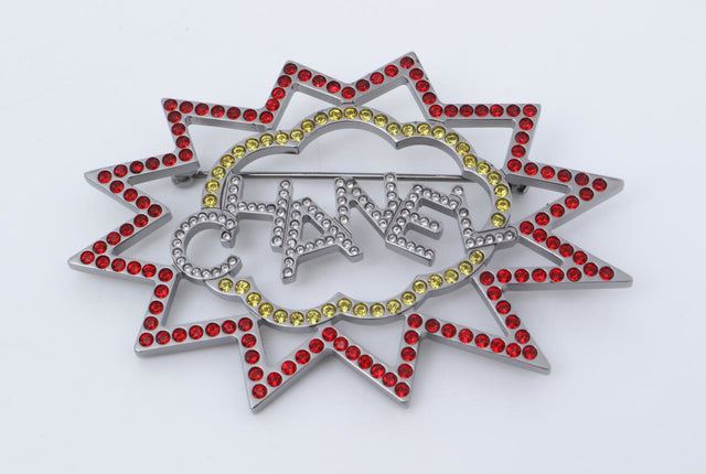 One Chanel Red and Yellow Ruthenium Crystal CC Brooch. Item is sold AS-IS. All available information is listed in the description and shown in the photo. This elegant Chanel brooch features a stunning array of red, yellow, white crystals, the CHANEL logo in stylized lettering and safety pin closure.