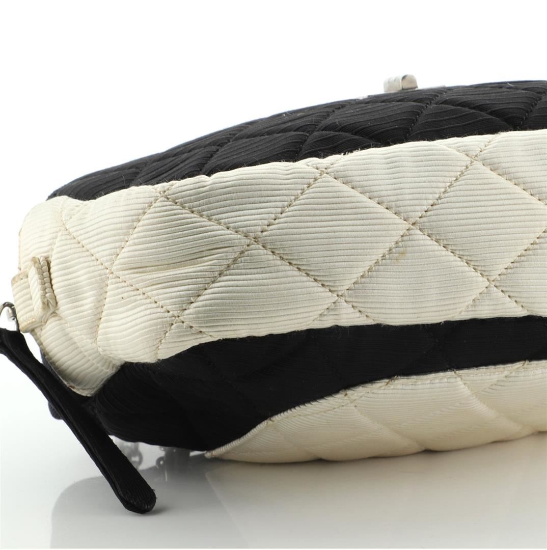One Chanel Reissue Camera Bag Quilted Grosgrain Small Black, Neutral. Item is sold AS-IS. All available information is listed in the description and shown in the photo. Chanel Reissue Camera Bag Quilted Grosgrain Small Black Neutral Grosgrain Condition Details: Odor in interior. Creasing on exterior, moderate discoloration and stains on rear pocket and base trim, scratches on hardware. Height 5", Width 9", Depth 1.5", Strap Drop 20.5