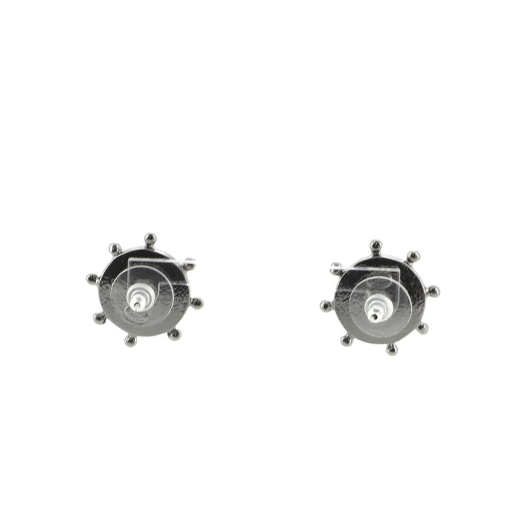 Chanel Ship Wheel Stud Earrings Metal with Rhinestone Silver Metal Rhinestone Condition Details: Minor wear on stems. eight 1.Width 1.Depth 1", Strap Drop -