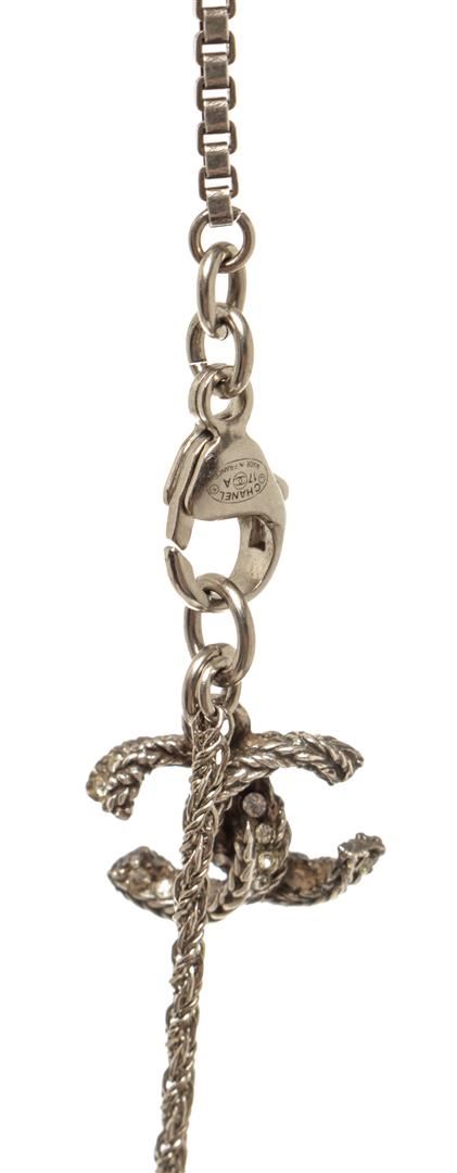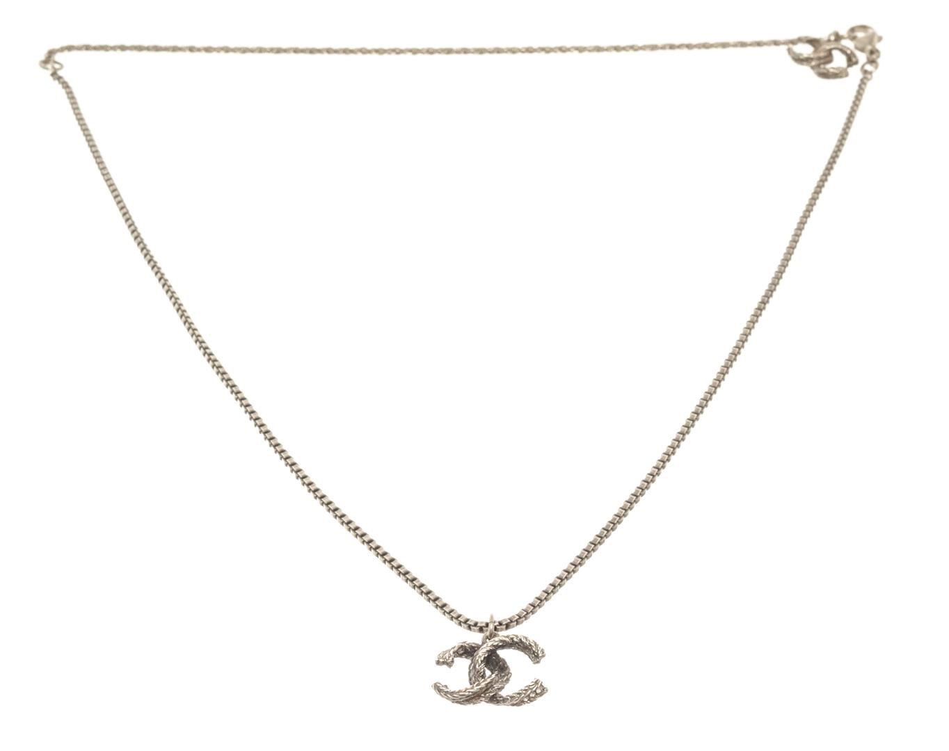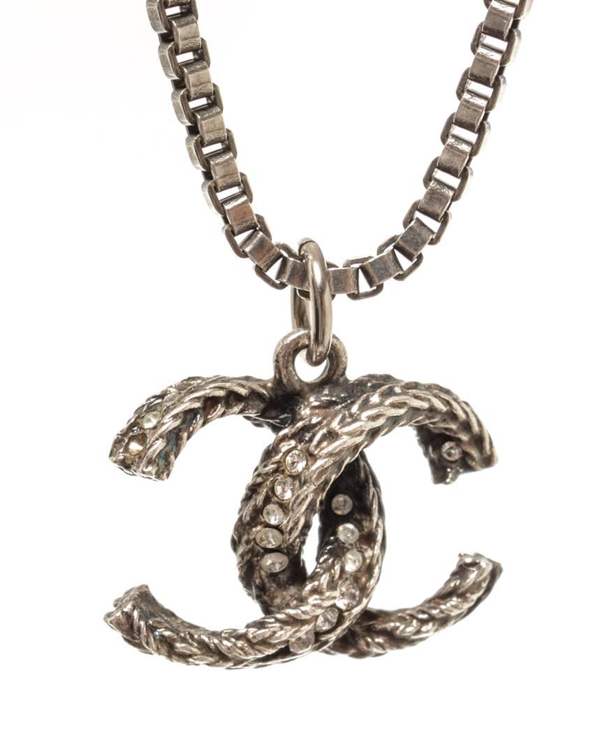 One Chanel Silver CC Chain Necklace. Item is sold AS-IS. All available information is listed in the description and shown in the photo. Chanel silver CC chain necklace features a silver-finished body, lobster claw closure with the Chanel stamp on it, a CC logo with rhinestones on it at the end of the chain, and a CC twist logo pendant with rhinestones on it.