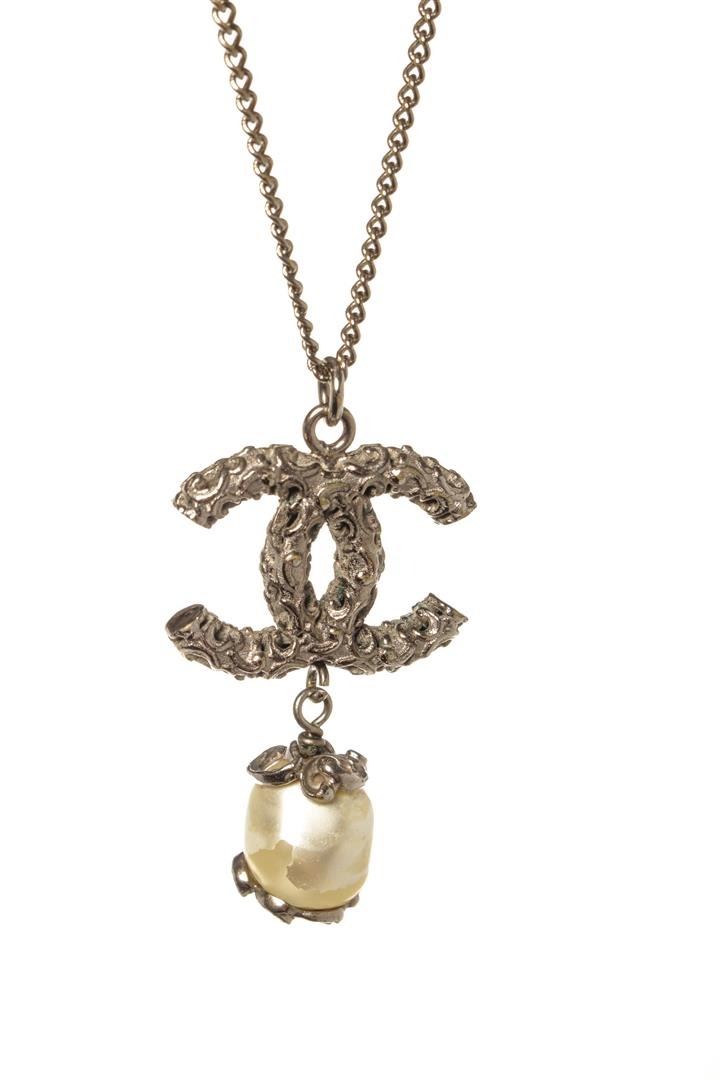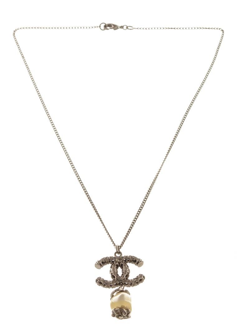 Chanel Silver CC Logo Pearl Drop Necklace. All available information is listed in the description and shown in the photos. Chanel Silver CC Pearl Drop Necklace with a faux pearl, silver tone metal hardware and logo, adjustable chain length (42cm-60cm).