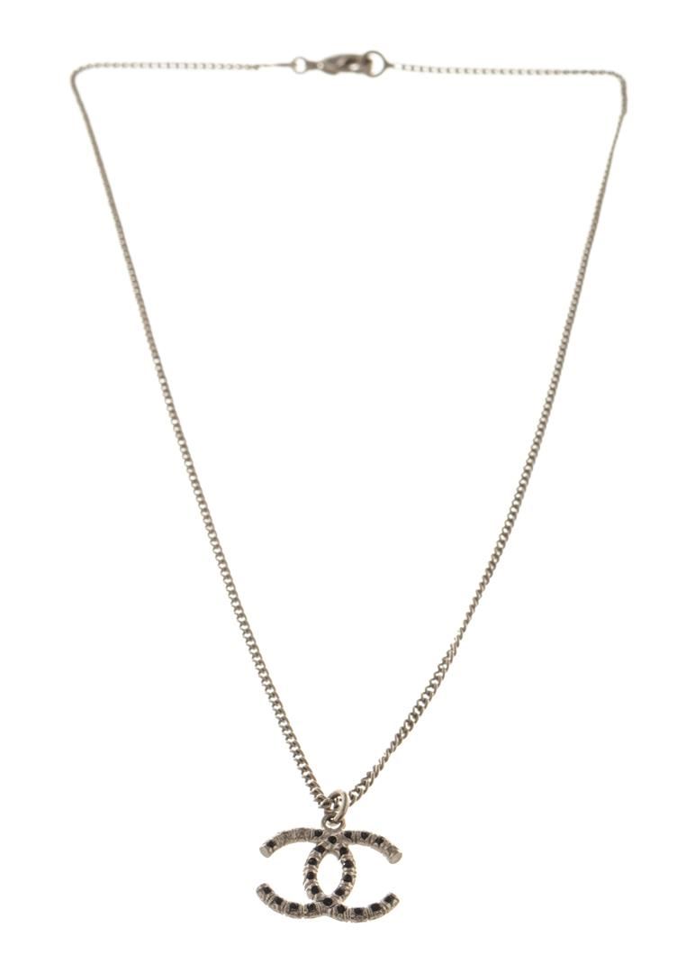Chanel Silver CC Logo Rhinestone Necklace. All available information is listed in the description and shown in the photos. Chanel Silver CC Logo Rhinestone Necklace with silver tone metal hardware and link, black rhinestones, and lobster claw clasp.