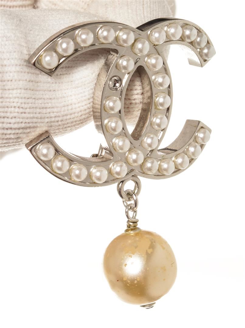 One Chanel Silver CC Pearl Drop. Item is sold AS-IS. All available information is listed in the description and shown in the photo. Chanel Silver CC Pearl Drop. Features silver hardware with a pearl drop.