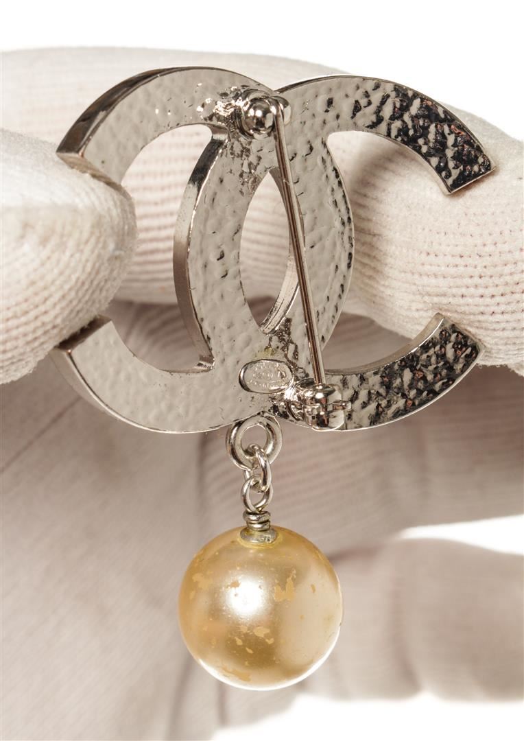One Chanel Silver CC Pearl Drop. Item is sold AS-IS. All available information is listed in the description and shown in the photo. Chanel Silver CC Pearl Drop. Features silver hardware with a pearl drop.