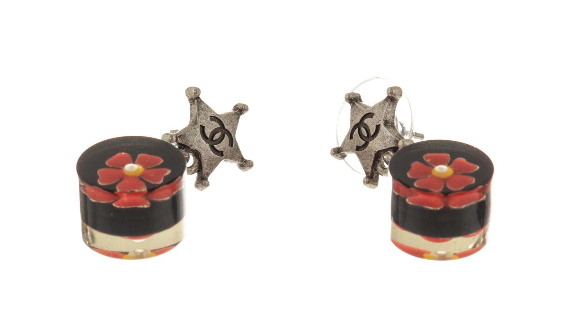 Chanel Silver CC Star Flower Earrings. All available information is listed in the description and shown in the photos. Chanel Silver CC Star Flower Earrings with silver tone metal hardware, logo engraving, and made in France.