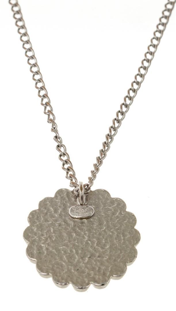 Chanel Silver Camelia CC Necklace with silver tone hardware.