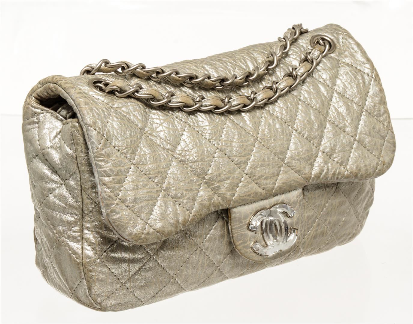 One Chanel Silver Crinkle Flap Shoulder Bag. Item is sold AS-IS. All available information is listed in the description and shown in the photo. Chanel Silver Crinkle Flap Shoulder Bag with chain shoulder bag, fabric lining, interior pockets, turn lock closure. This item is in fair condition. Please refer to photos