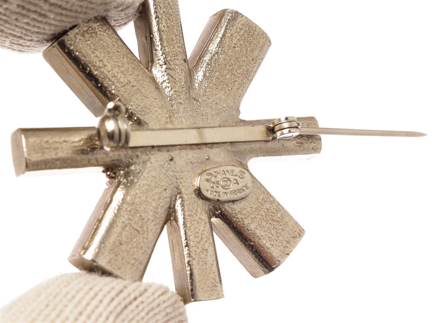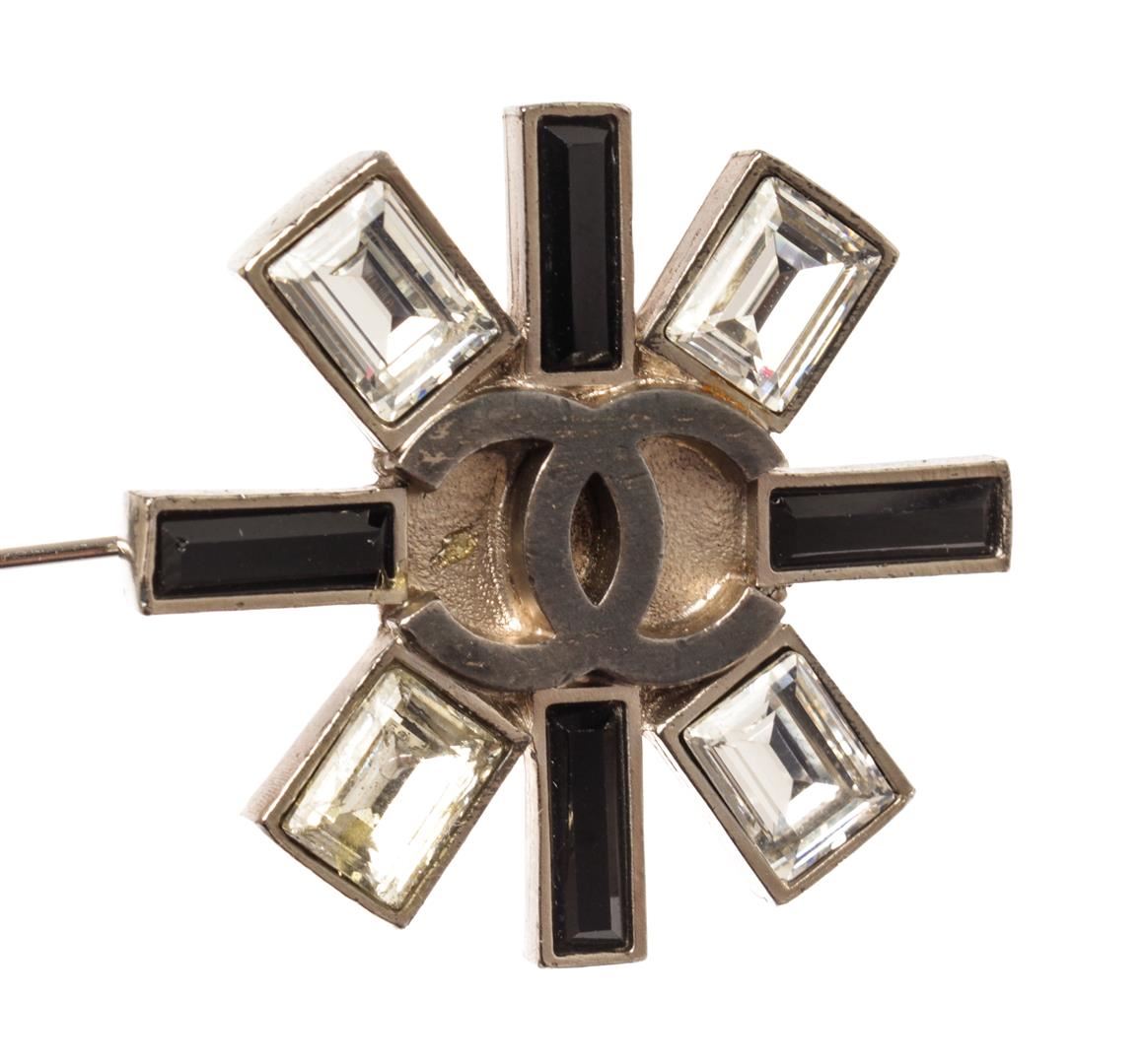 Chanel Silver Metal Logo CC Strass Brooch. All available information is listed in the description and shown in the photos. Chanel Silver Metal Logo CC Strass Brooch with silver-tone hardware, cc logo in the middle, cross shape, pin closure on back. L: 36 x W: 39 x H: 9 mm, 1.41 x 1.53 x 0.35 Inches