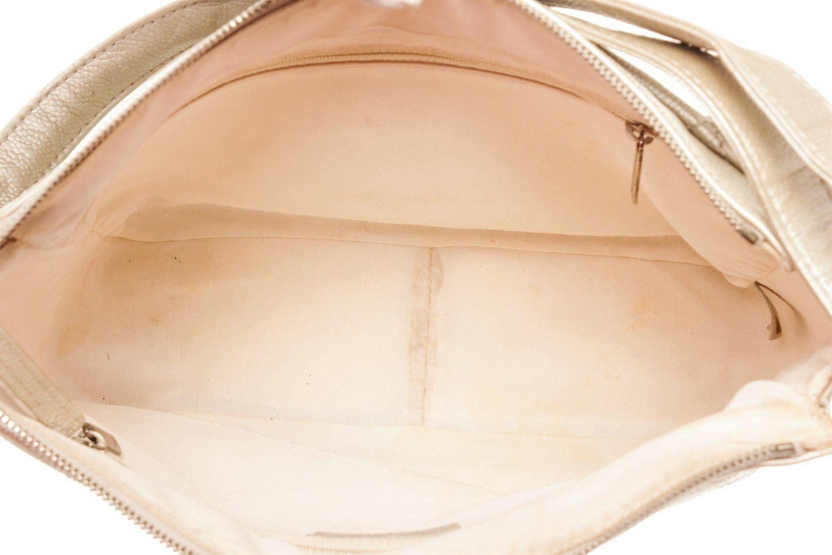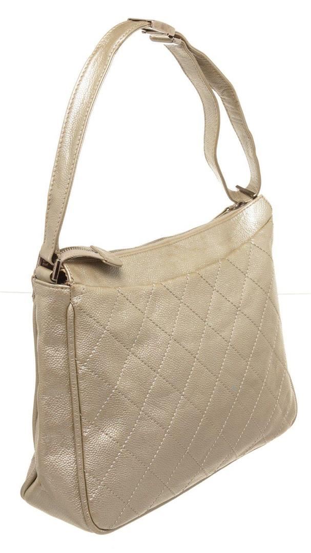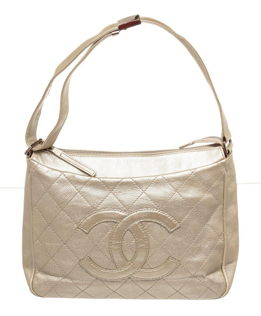 Chanel Silver Metallic Caviar CC Shoulder Bag with caviar, silver-tone hardware, trim leather, interior zip pockets, shoulder strap and zipper closure.