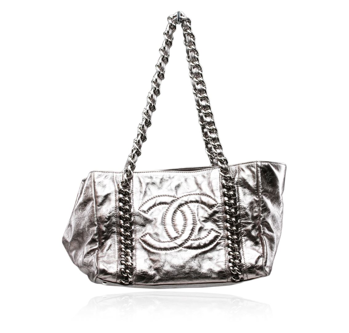 One Chanel Silver Metallic Cracked Calfskin Modern Chain Tote featuring: a large embroidered Chanel CC logo and thick metallic chain link top straps threaded with silver leather that are incorporated into the bag. The top is open to a gray fabric interior with pockets. Measurements: 12 x 8 x 8 x 10".