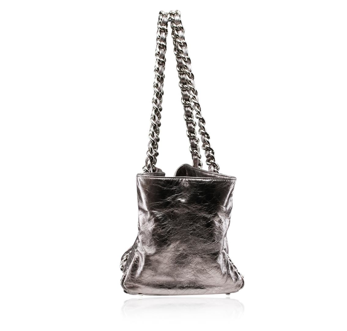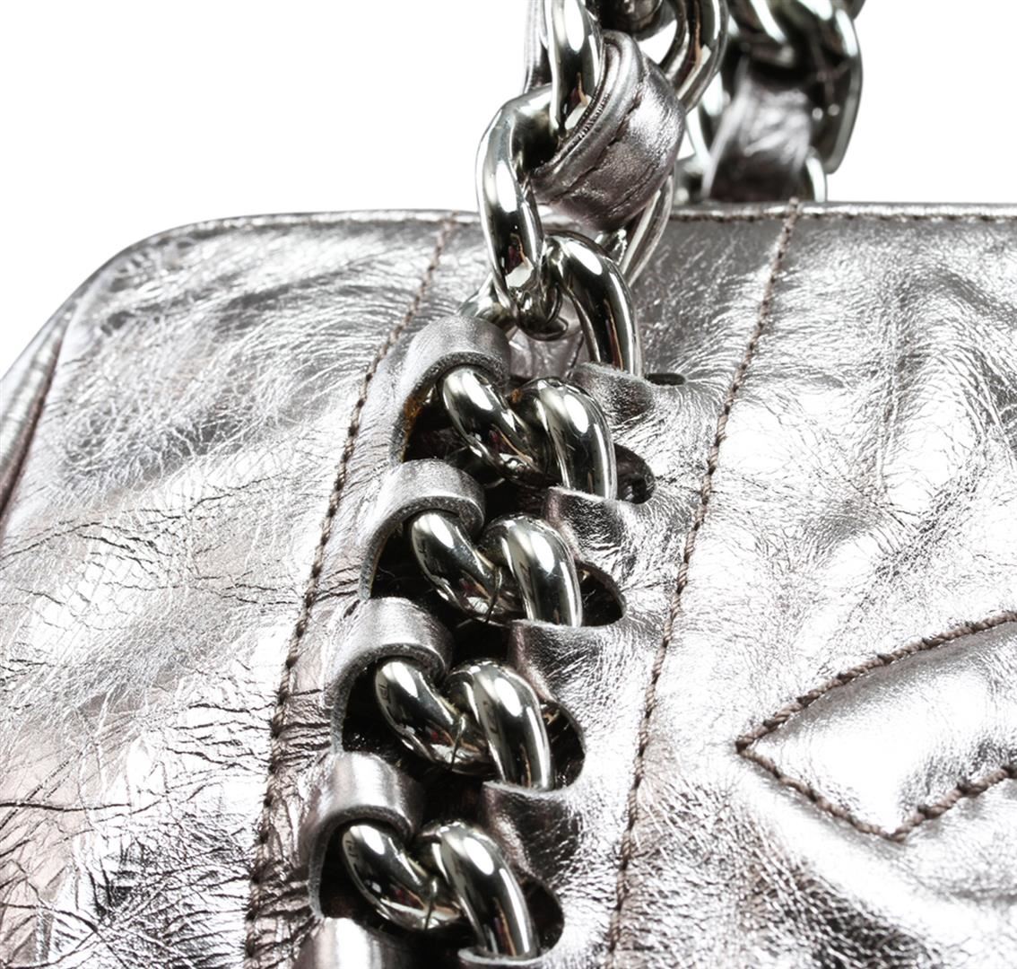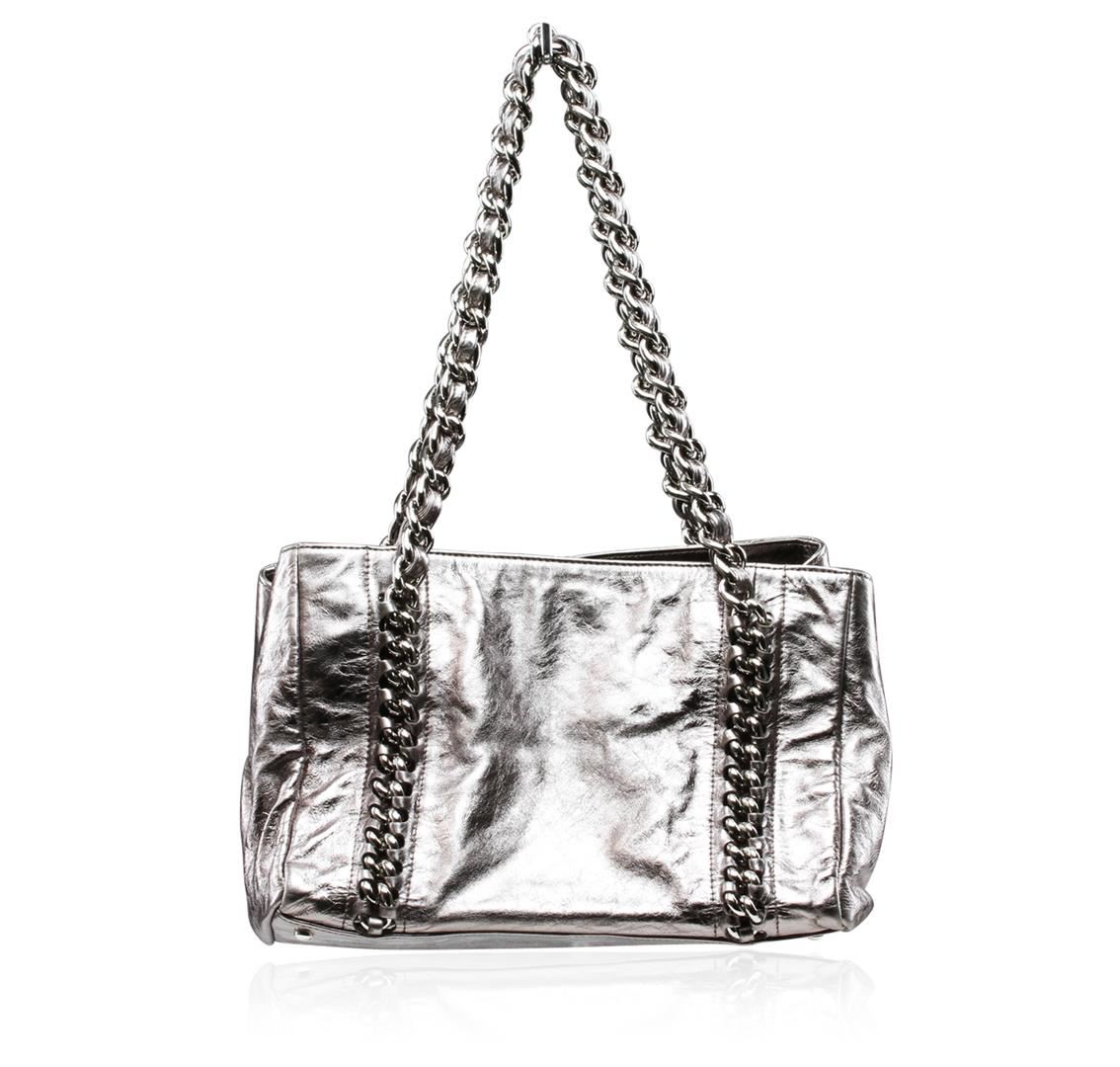 One Chanel Silver Metallic Cracked Calfskin Modern Chain Tote featuring: a large embroidered Chanel CC logo and thick metallic chain link top straps threaded with silver leather that are incorporated into the bag. The top is open to a gray fabric interior with pockets. Measurements: 12 x 8 x 8 x 10".
