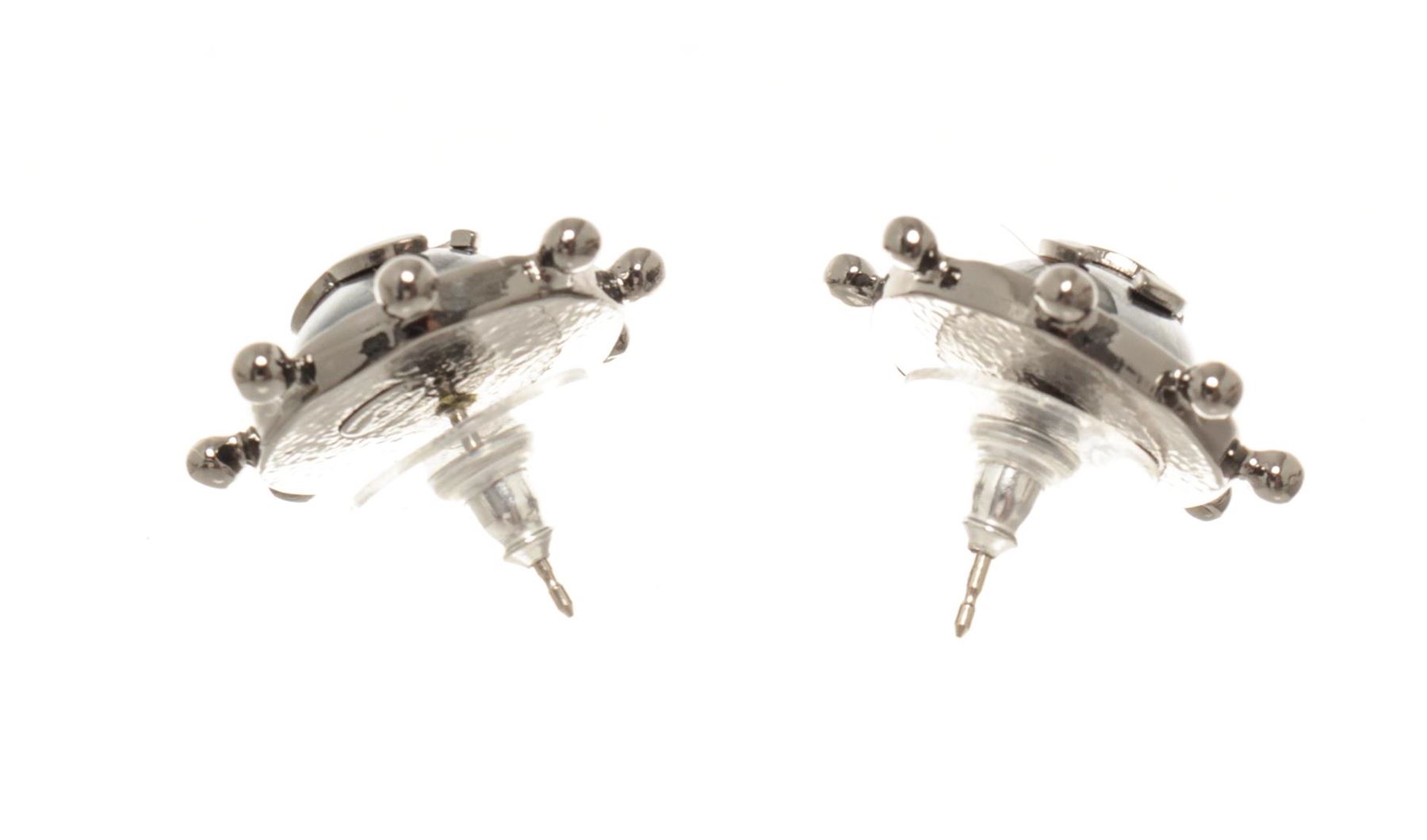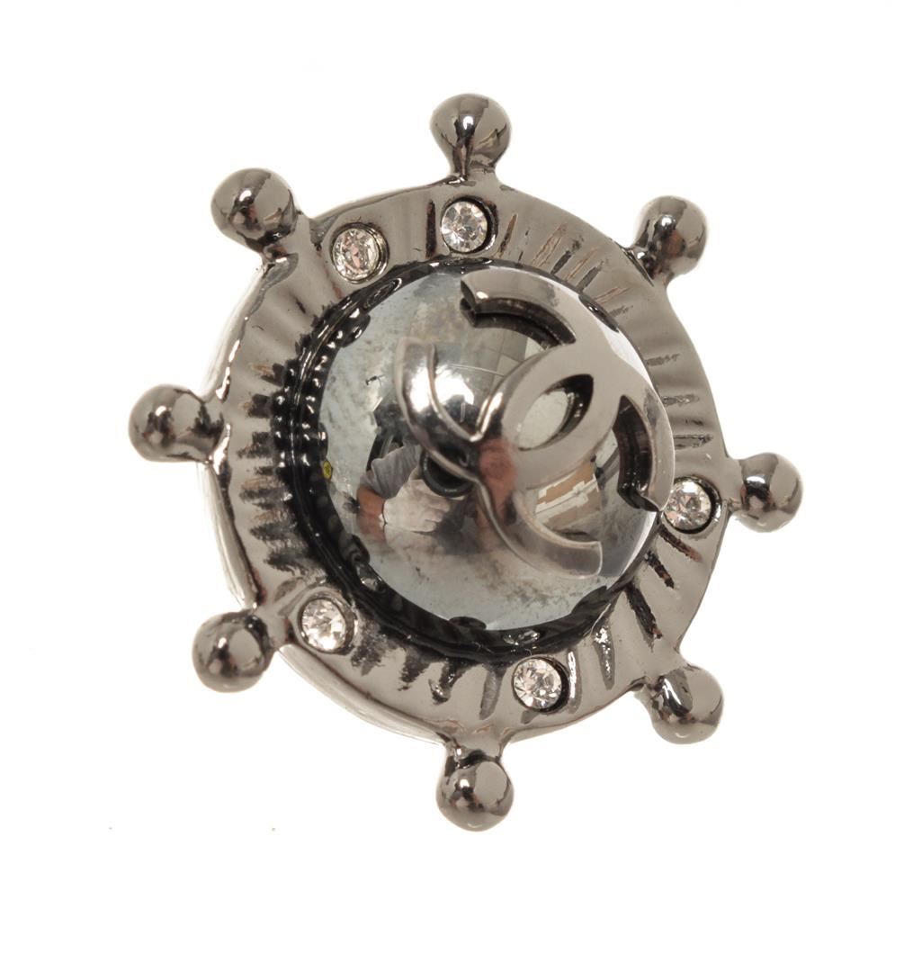 One Chanel Silver Ship Wheel Stud Earring. Item is sold AS-IS. All available information is listed in the description and shown in the photo. Chanel silver ship wheel stud earrings with silver-tone hardware, ship wheel shaped earrings with the CC logo in the center, rhinestones, Chanel logo on the back, and stud backing.