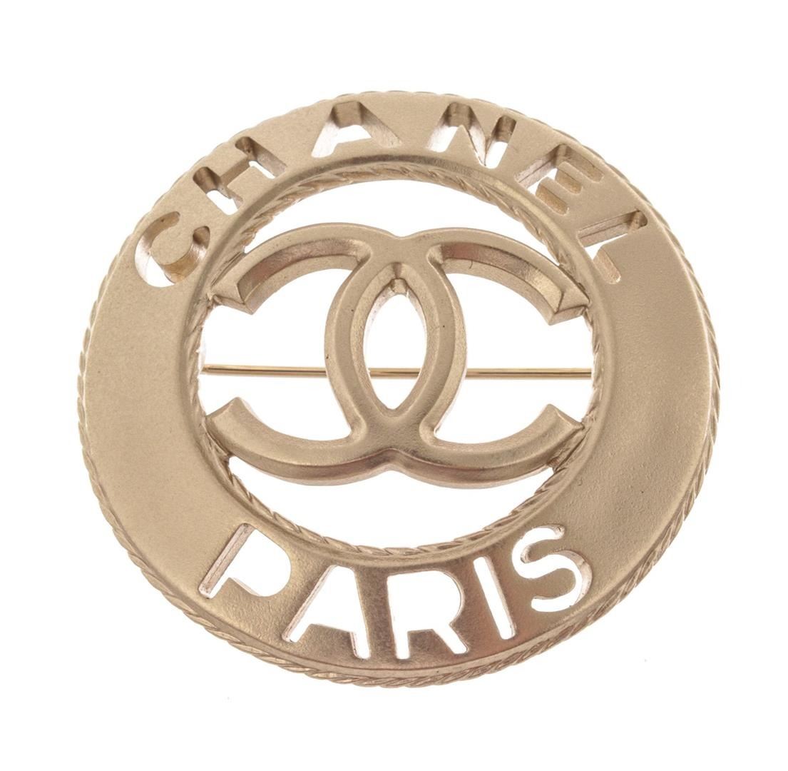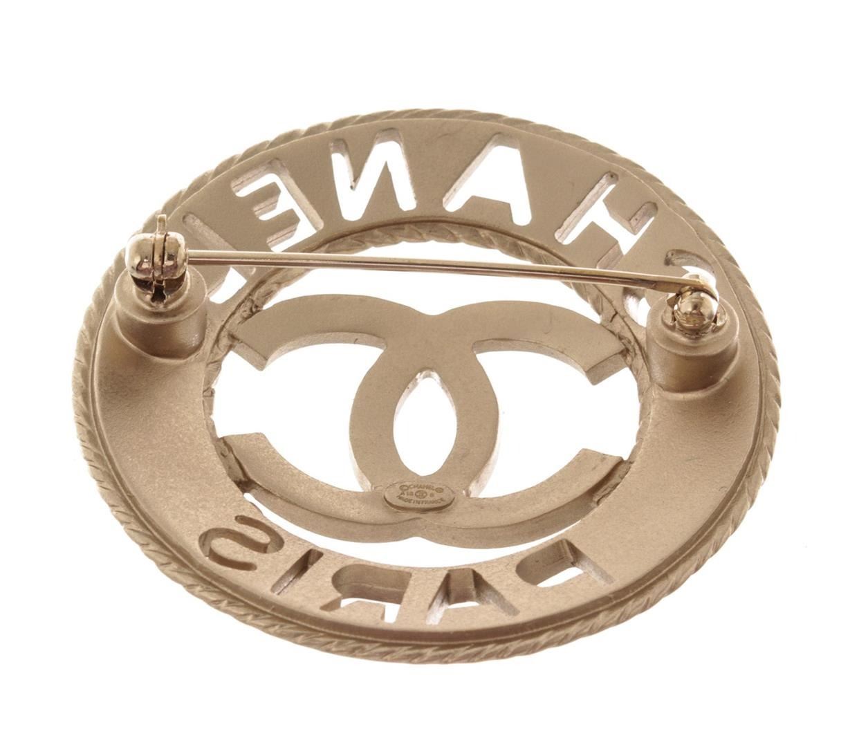 Chanel Silver-tone Metal CC Paris Round Brooch features interlocking CC logo at the center and silver-tone hardware.