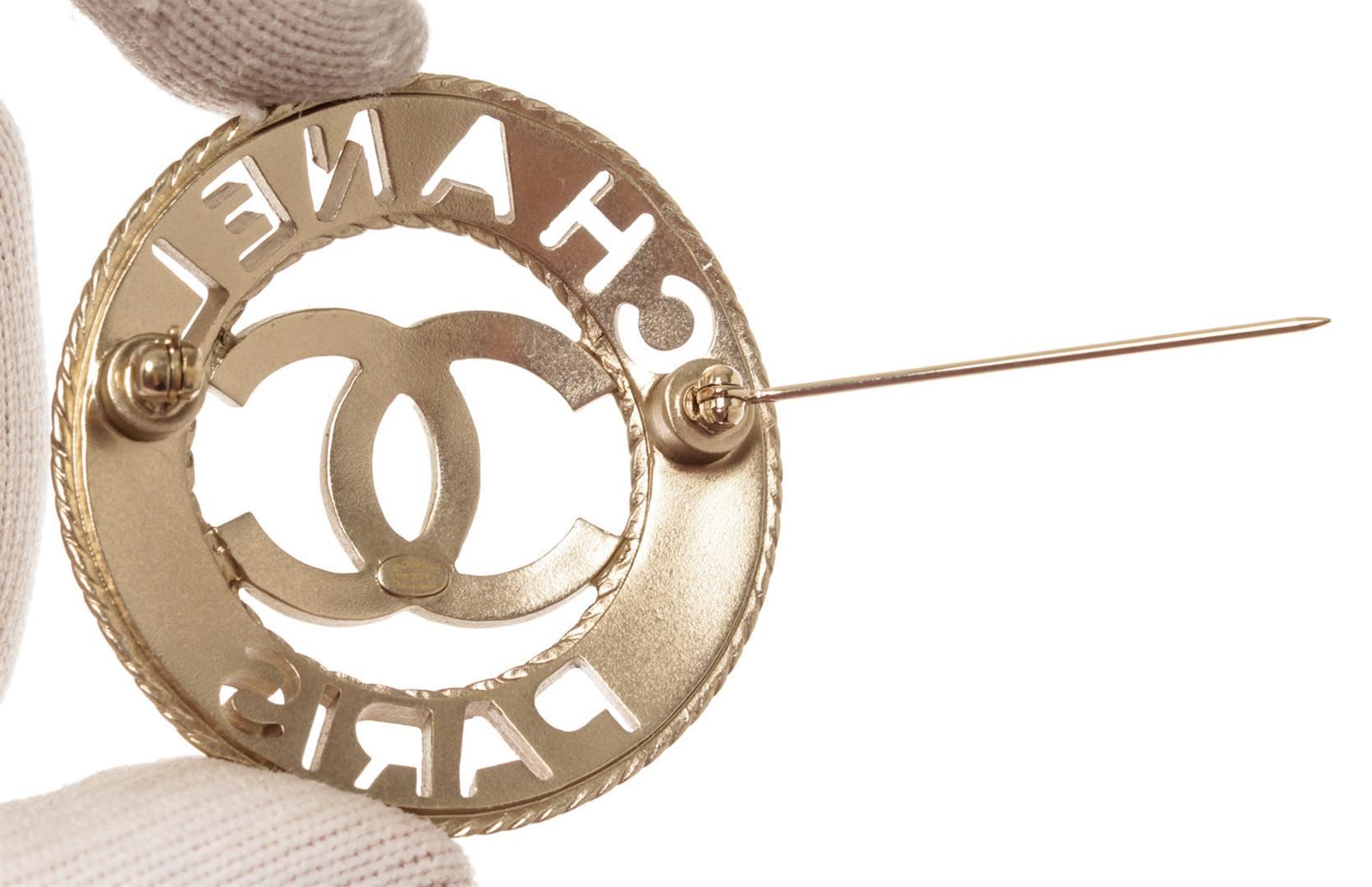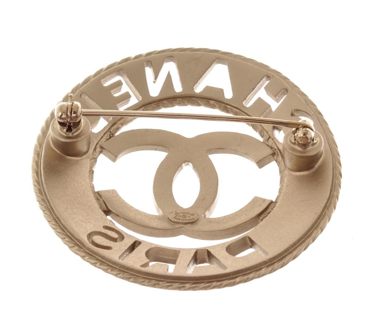 Chanel Silver-tone Metal CC Paris Round Brooch. All available information is listed in the description and shown in the photos. Chanel Silver-tone Metal CC Paris Round Brooch features interlocking CC logo at the center and silver-tone hardware.