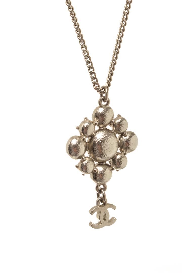 Chanel Silver-toned CC Flower Drop Necklace. All available information is listed in the description and shown in the photos. Chanel silver-toned CC flower drop necklace with silver-toned chain, lobster claw closure with multiple length options, and flower-shaped rhinestone pendant with a CC logo on the bottom.