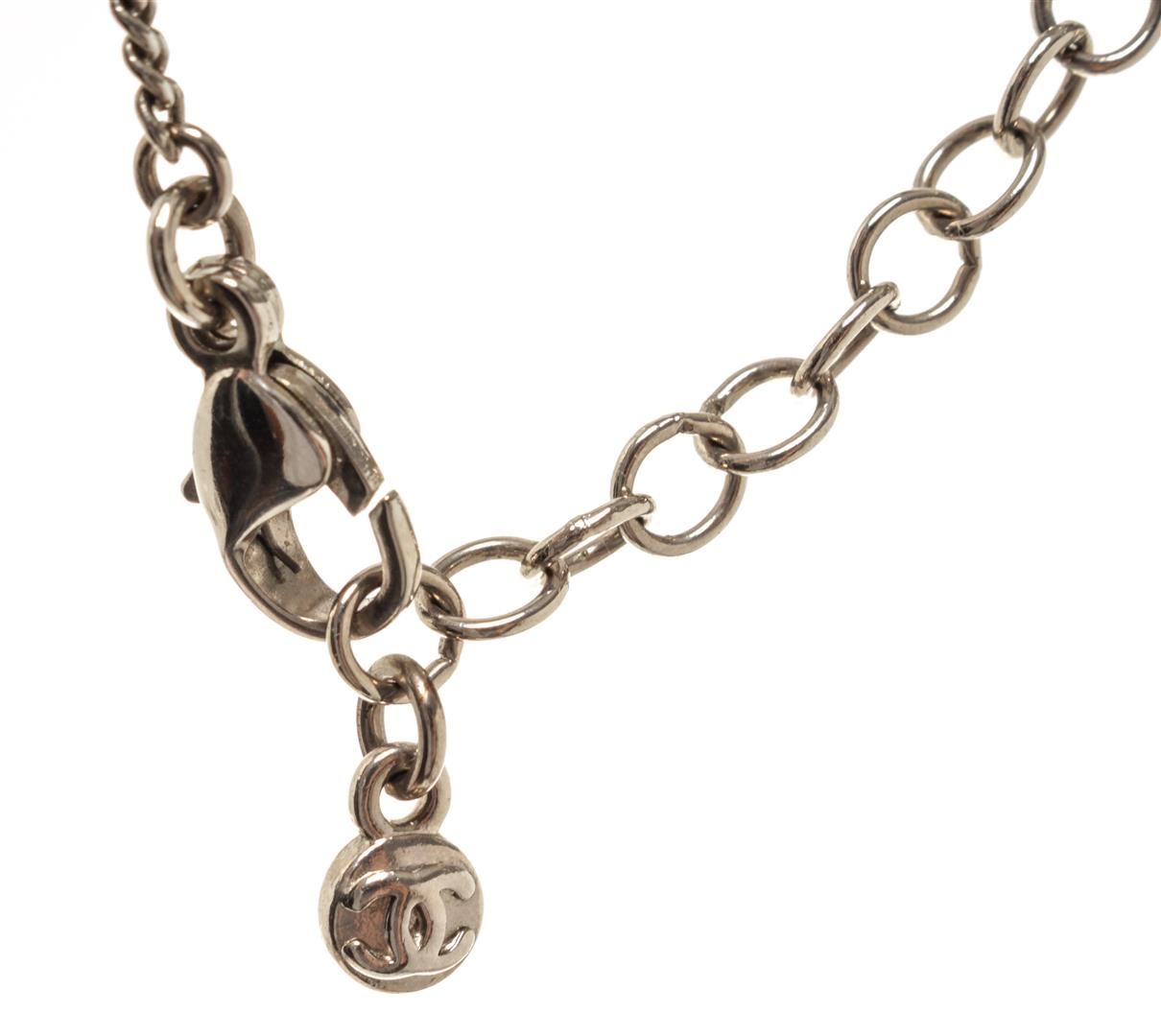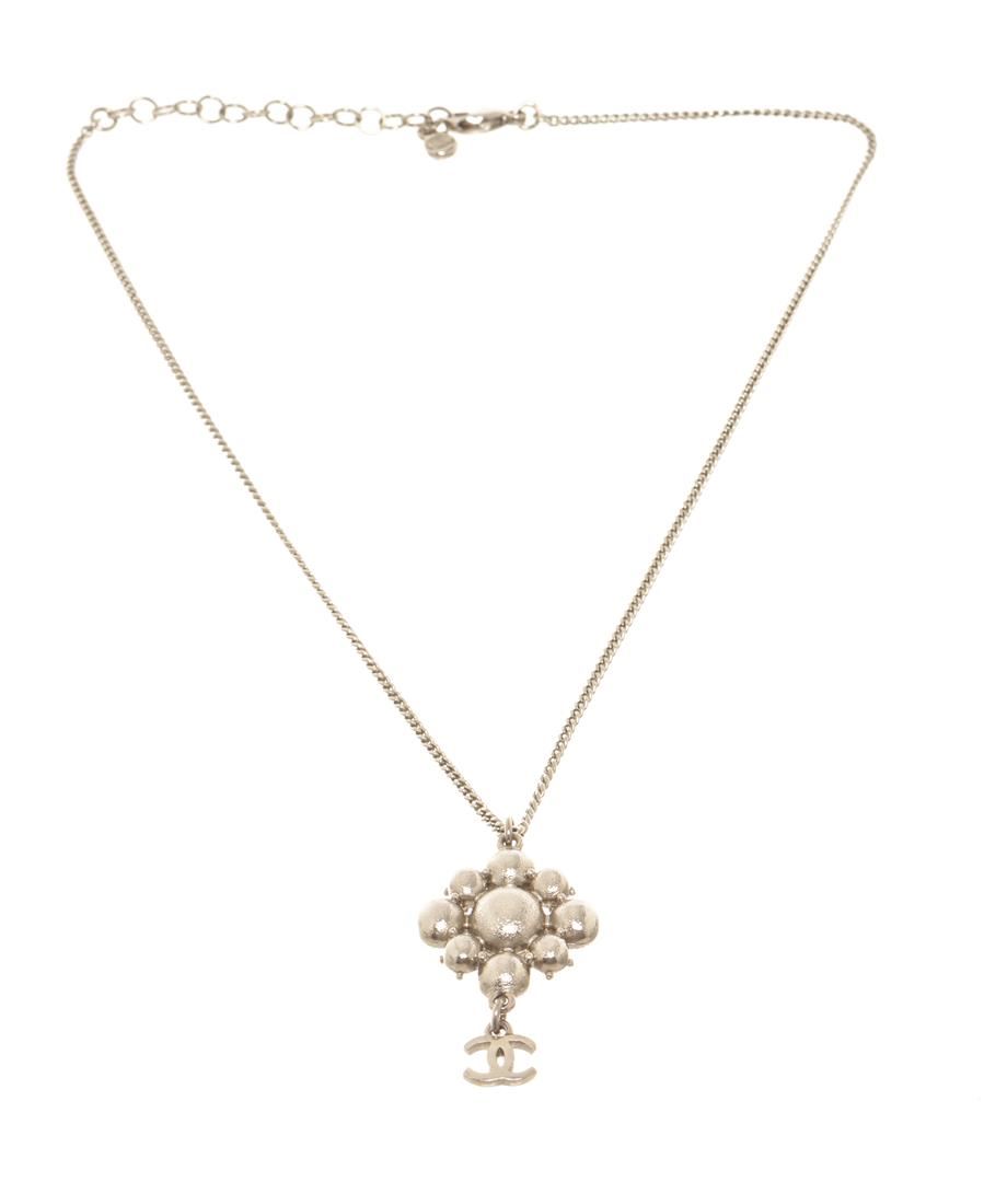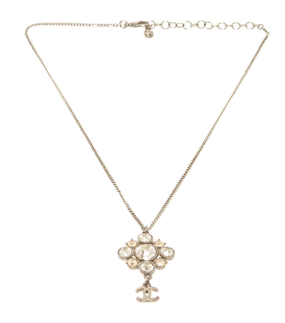 Chanel Silver-toned CC Flower Drop Necklace. All available information is listed in the description and shown in the photos. Chanel silver-toned CC flower drop necklace with silver-toned chain, lobster claw closure with multiple length options, and flower-shaped rhinestone pendant with a CC logo on the bottom.