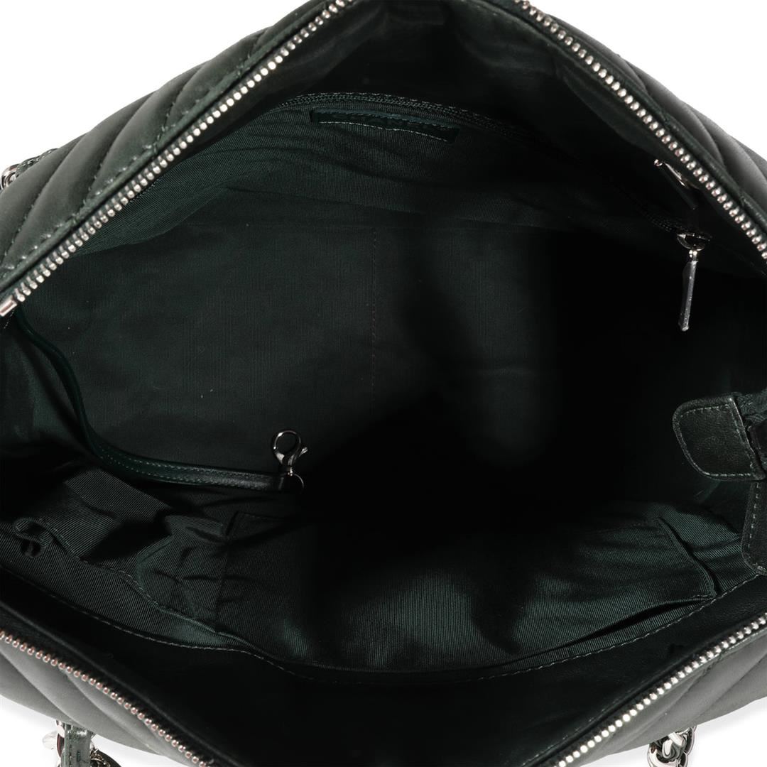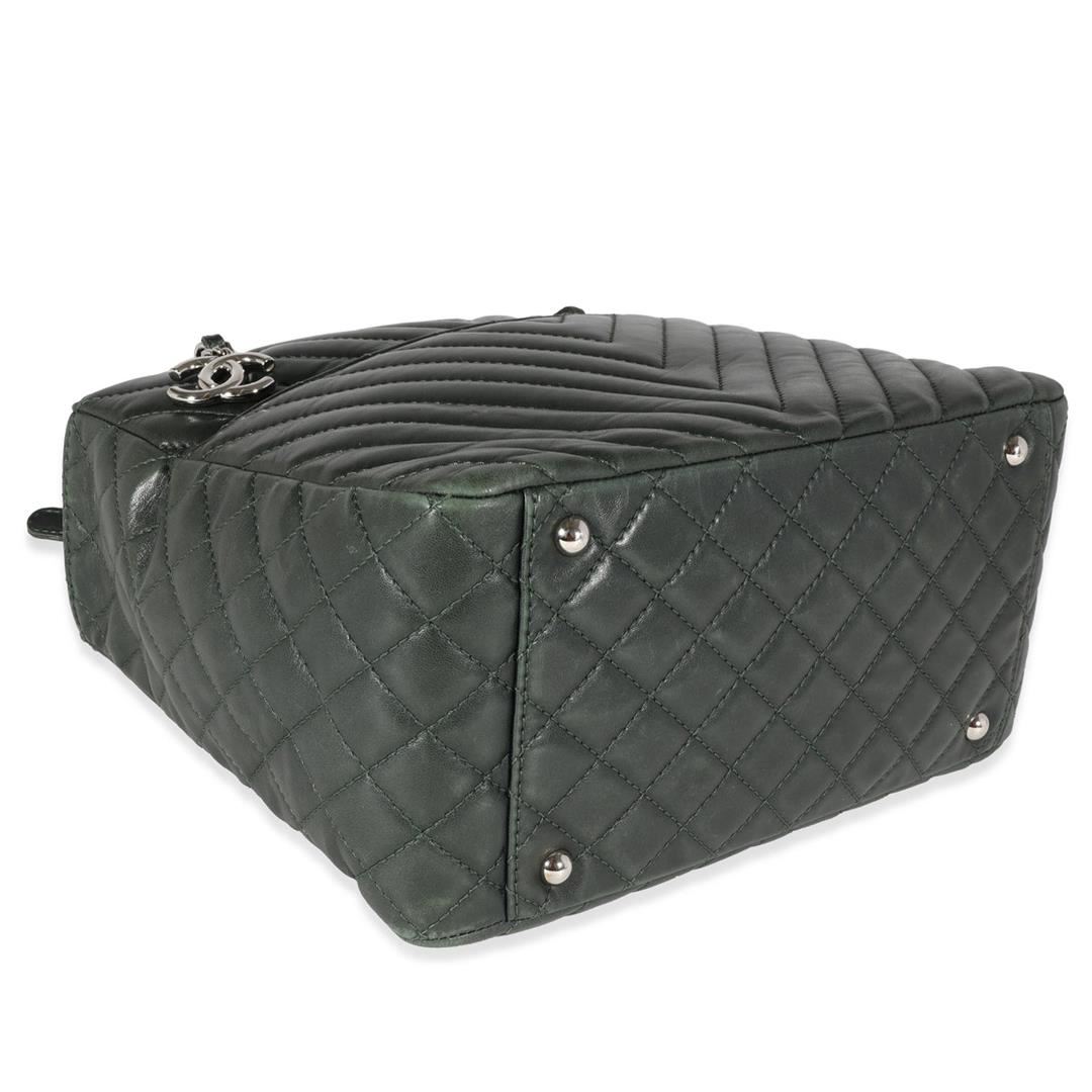 One Chanel Surpique Tote. Item is sold AS-IS. All available information is listed in the description and shown in the photo. Chanel Olive Green Chevron Quilted Surpique Tote. Features silver hardware, green leather strap, green canvas interior, and a zipper closure.