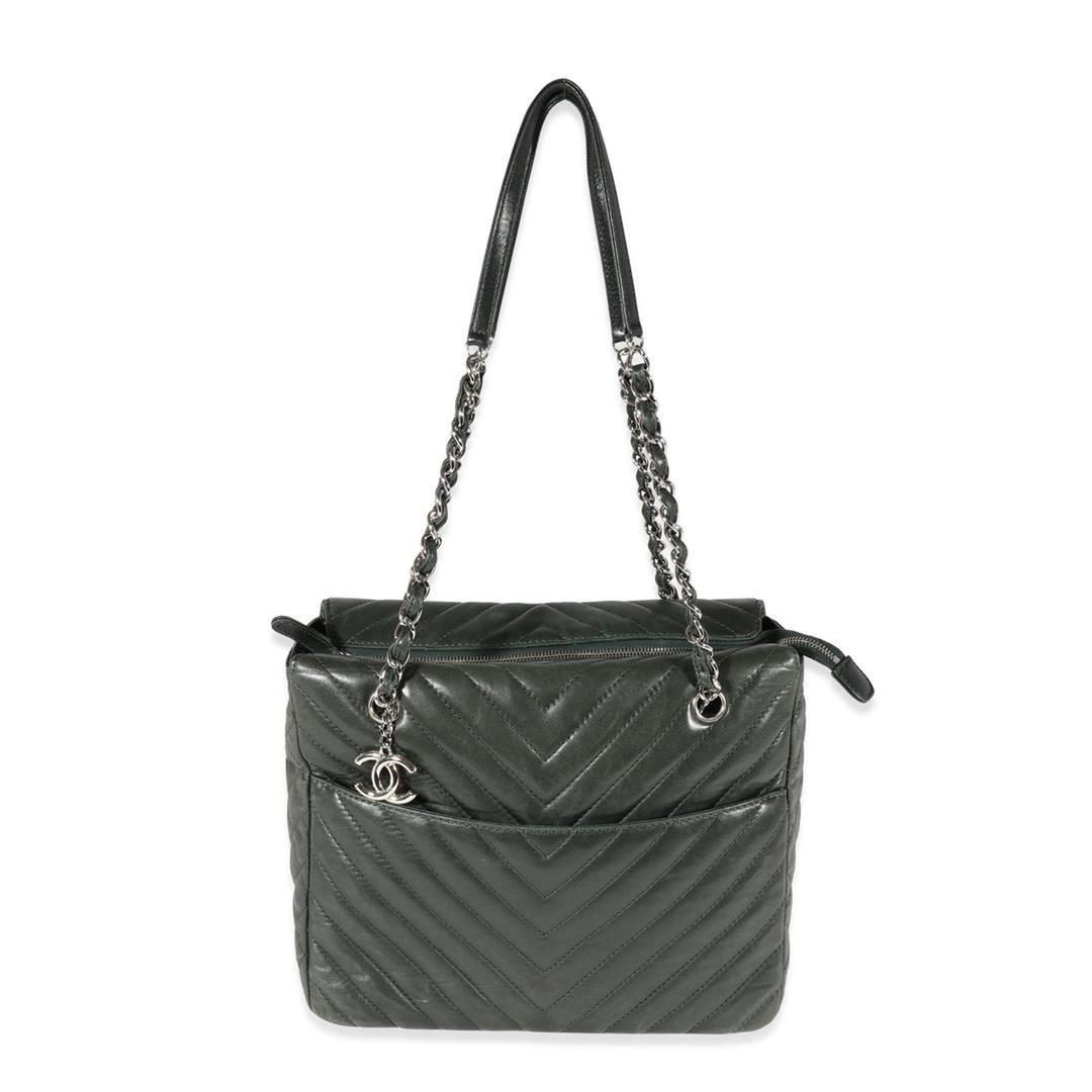 One Chanel Surpique Tote. Item is sold AS-IS. All available information is listed in the description and shown in the photo. Chanel Olive Green Chevron Quilted Surpique Tote. Features silver hardware, green leather strap, green canvas interior, and a zipper closure.