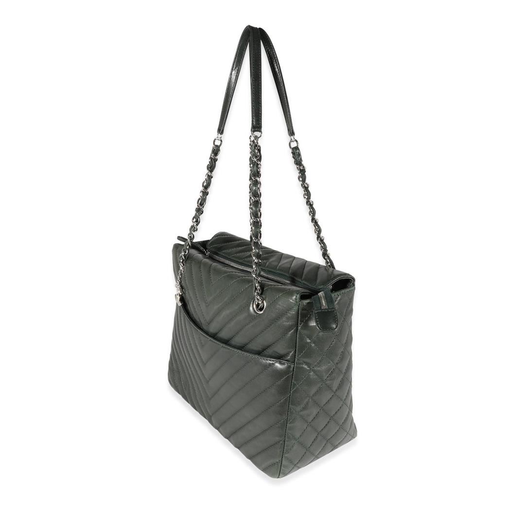 One Chanel Surpique Tote. Item is sold AS-IS. All available information is listed in the description and shown in the photo. Chanel Olive Green Chevron Quilted Surpique Tote. Features silver hardware, green leather strap, green canvas interior, and a zipper closure.