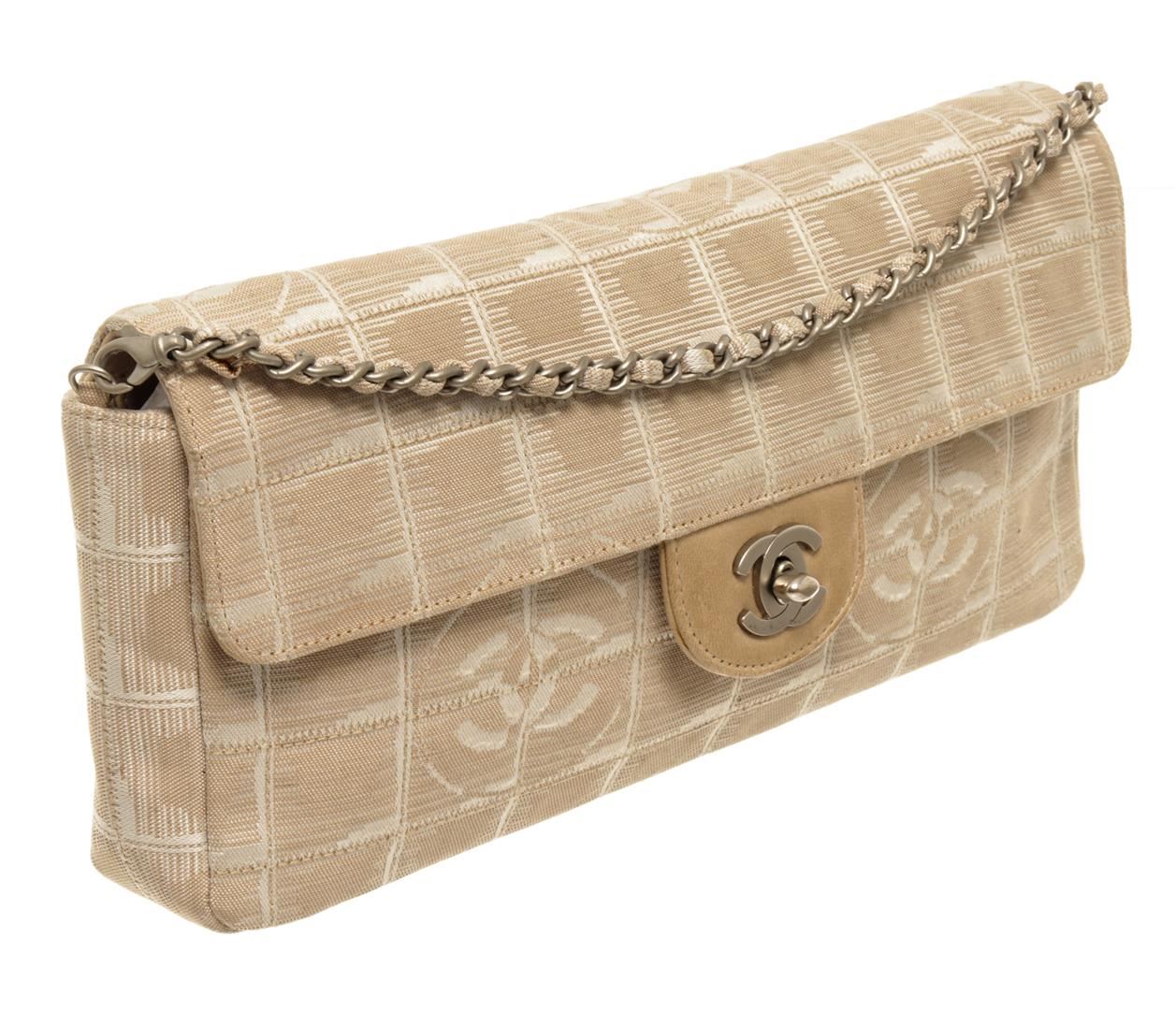 One Chanel Tan Quilted Nylon New Travel Line Flap Shoulder Bag. Item is sold AS-IS. All available information is listed in the description and shown in the photo. Chanel Tan Quilted Nylon New Travel Line Flap Shoulder Bag. The front has a flap with a CC logo twistlock. The underside of the flap is lined with leather and the inside is lined with nylon with 3 pockets. It can be carried on the shoulder with the optional woven nylon and chain-link strap.