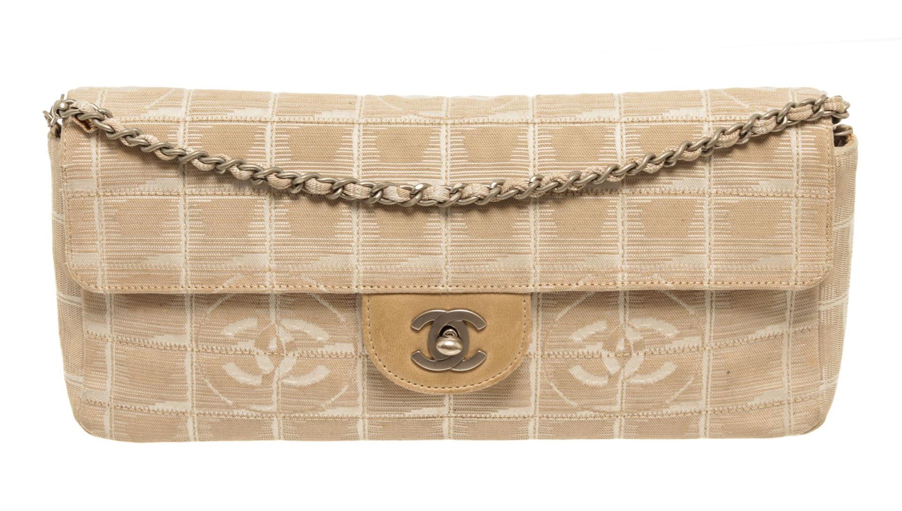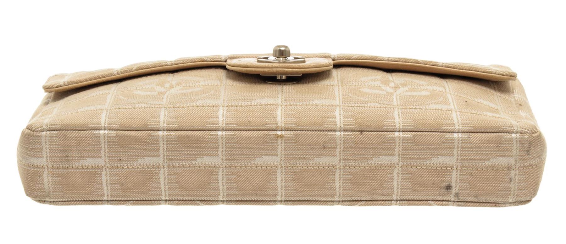 One Chanel Tan Quilted Nylon New Travel Line Flap Shoulder Bag. Item is sold AS-IS. All available information is listed in the description and shown in the photo. Chanel Tan Quilted Nylon New Travel Line Flap Shoulder Bag. The front has a flap with a CC logo twistlock. The underside of the flap is lined with leather and the inside is lined with nylon with 3 pockets. It can be carried on the shoulder with the optional woven nylon and chain-link strap.