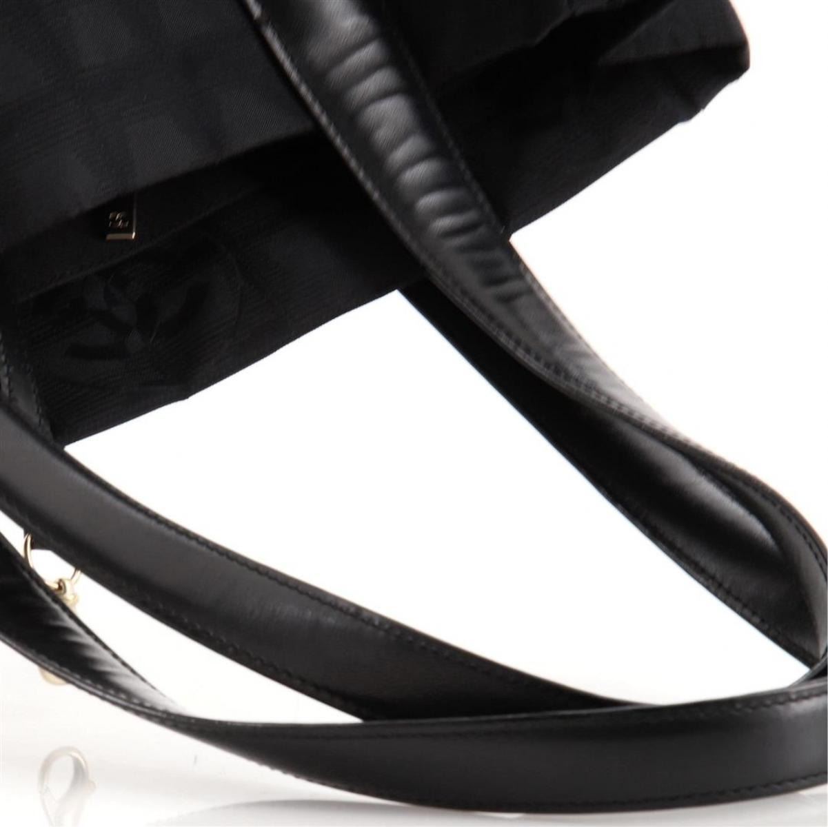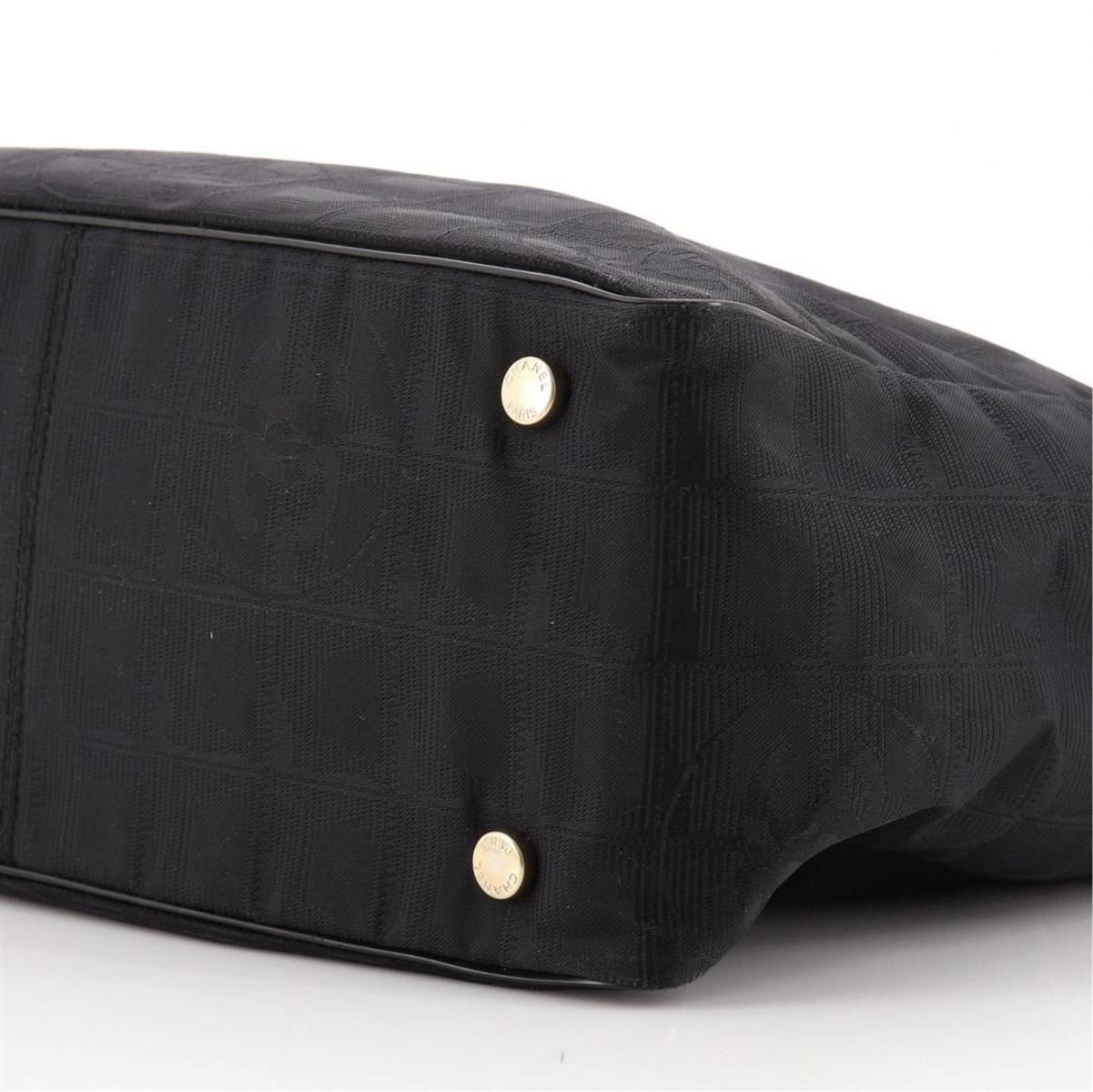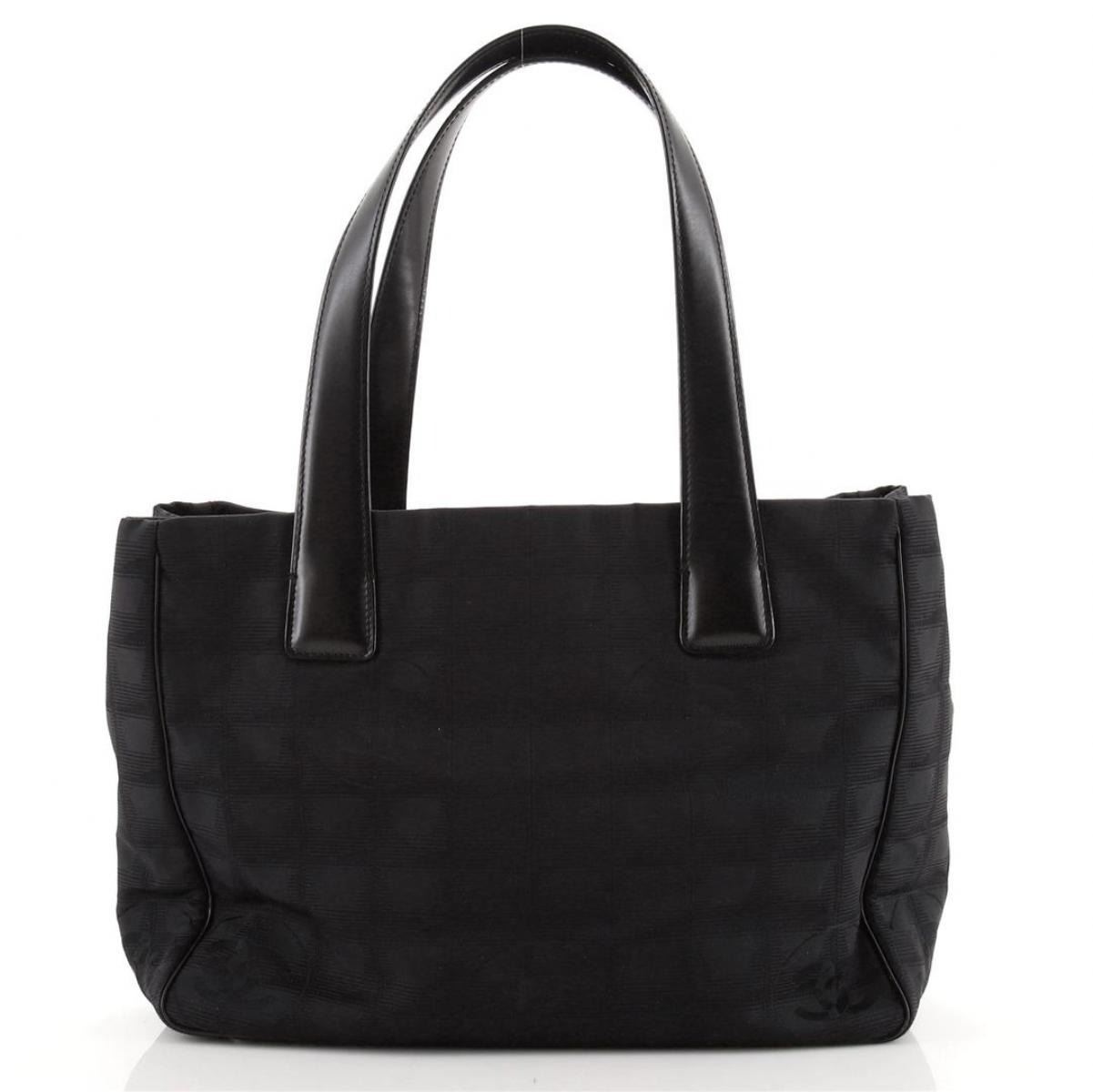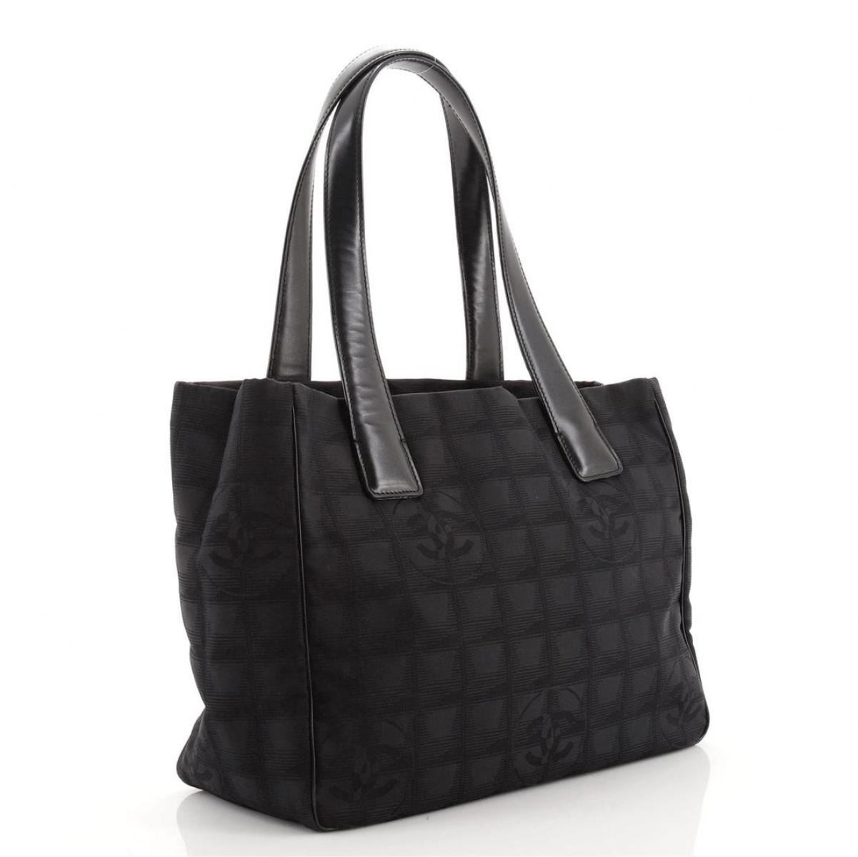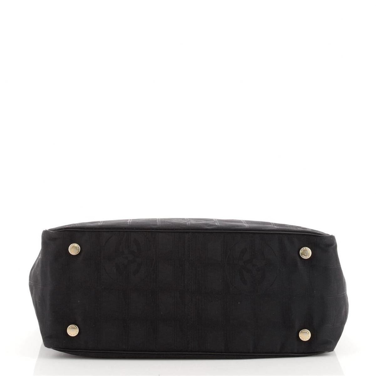 Chanel Travel Line Tote Nylon Small Black Nylon Condition Details: Creasing near base and on handles, minor scuffs on handles, splitting on front handle wax edges. Stains on interior side opening, scratches and discoloration on hardware. eight 8.5"