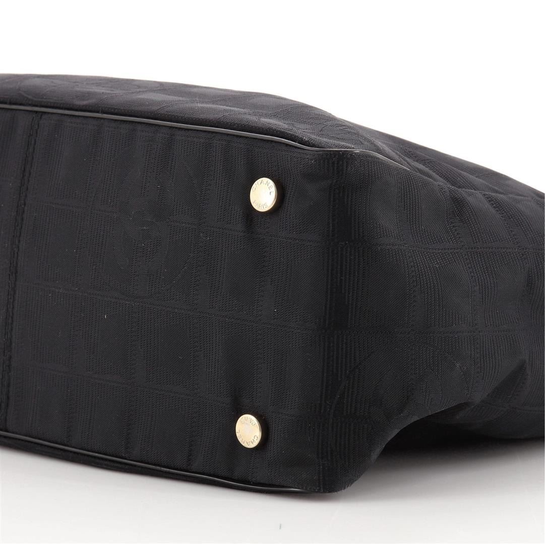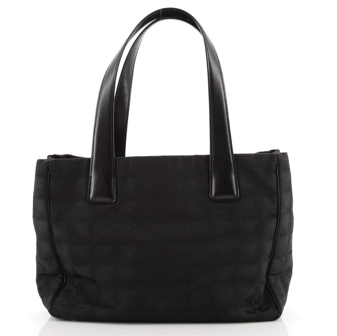 Chanel Travel Line Tote Nylon Small Black. All available information is listed in the description and shown in the photos. Chanel Travel Line Tote Nylon Small Black Nylon Condition Details: Creasing near base and on handles, minor scuffs on handles, splitting on front handle wax edges. Stains on interior side opening, scratches and discoloration on hardware. Height 8.5", Width 11", Depth 5", Strap Drop -