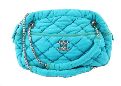One Chanel Turquoise Blue Quilted Bubble Jersey Snake Effect Chain Shoulder Bag. Item is sold AS-IS. All available information is listed in the description and shown in the photo. Chanel Turquoise Quilted Bubble Jersey Snake Effect Chain shoulder bag is crafted in a quilted pattern, this bag features a fabric shoulder pad with snake-effect chain link straps in silver-tone hardware. The full zipper closure opens to a finely black textile-lined interior with one zip pocket and two slip pockets. Length 27 cm, Width 9 cm, Height 18 cm, Handle Drop 29 cm