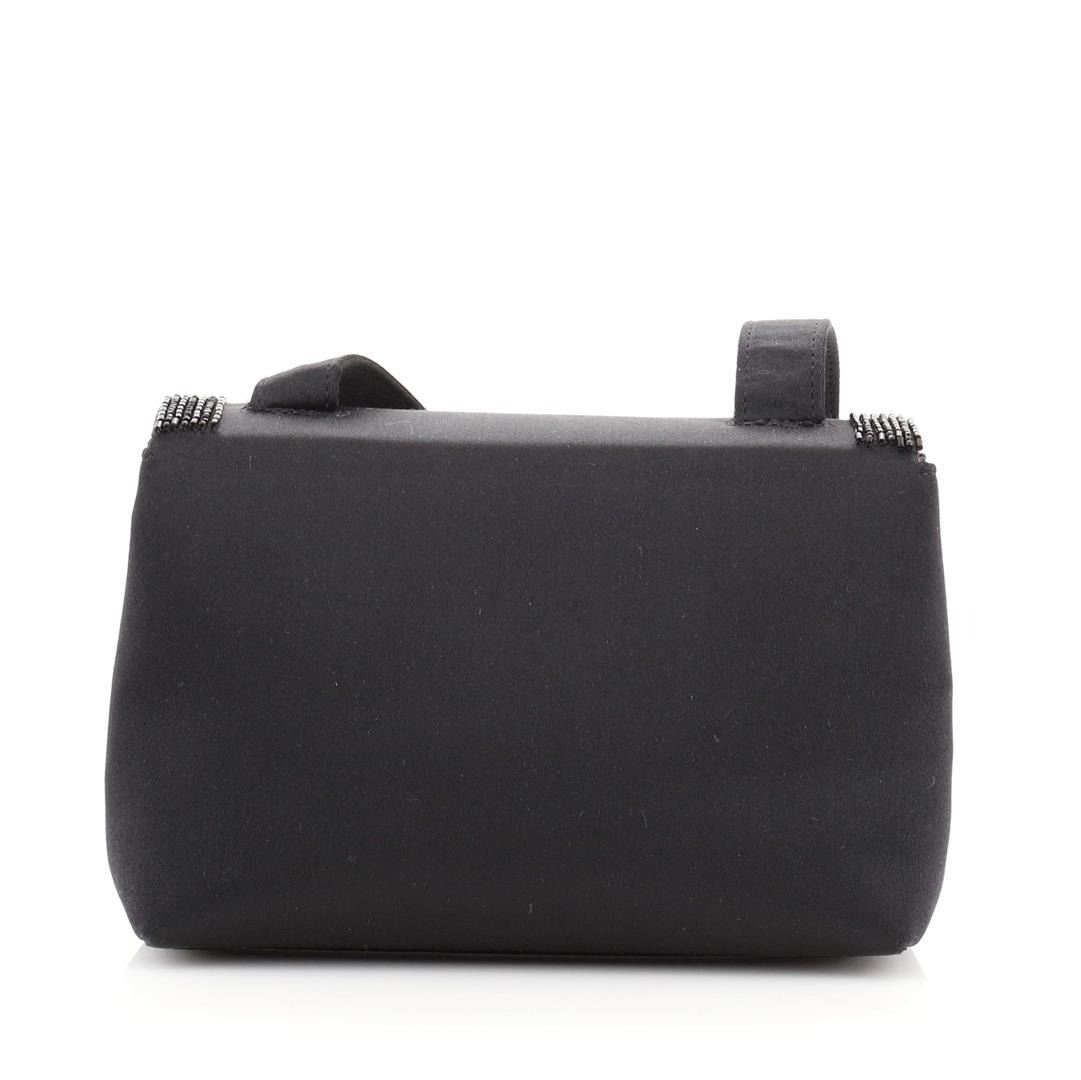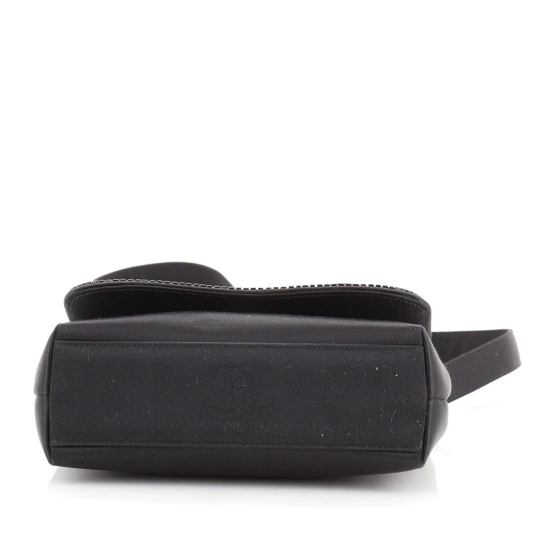 One Chanel VIntage Curved Flap Crossbody Beaded Satin Mini Black. Item is sold AS-IS. All available information is listed in the description and shown in the photo. Chanel VIntage Curved Flap Crossbody Beaded Satin Mini Black Condition Details: Missing bead on flap. Indentations underneath flap, minor wear on base corners and in interior, scratches on hardware. Height 4.5", Width 6.5", Depth 2.5", Strap Drop 21.5